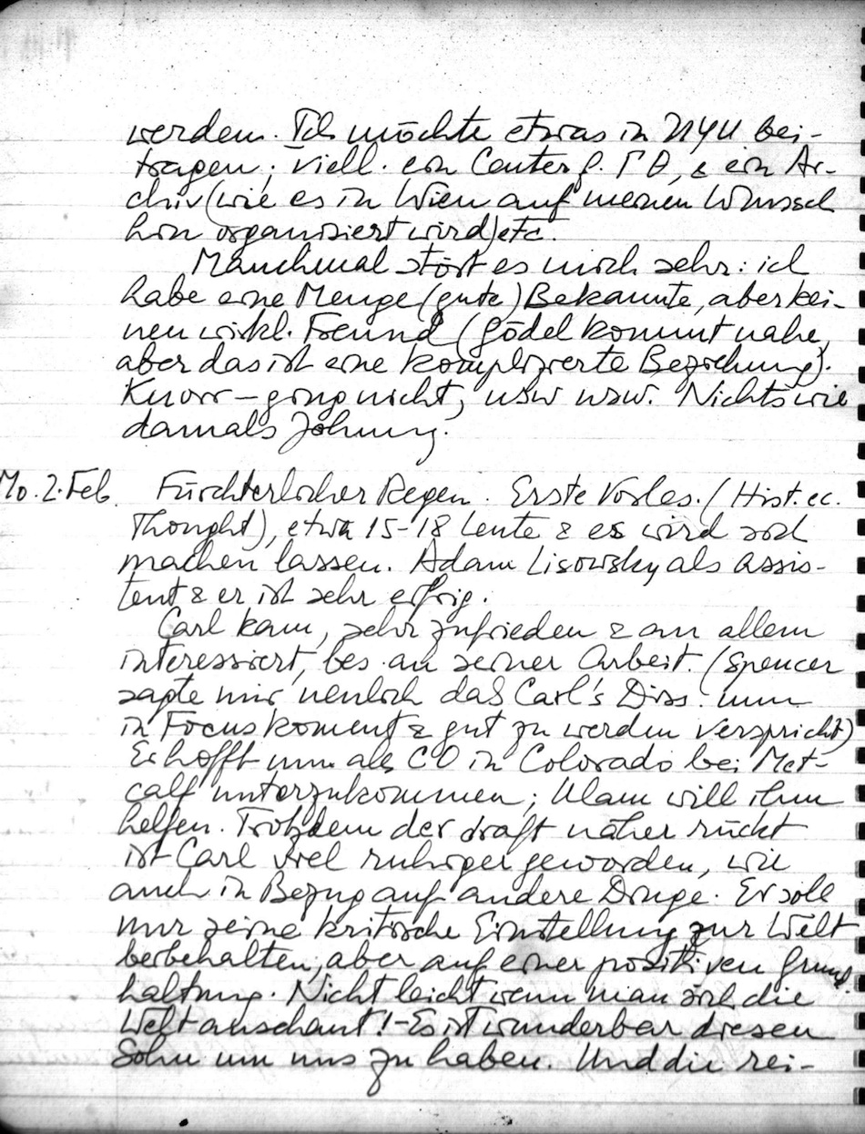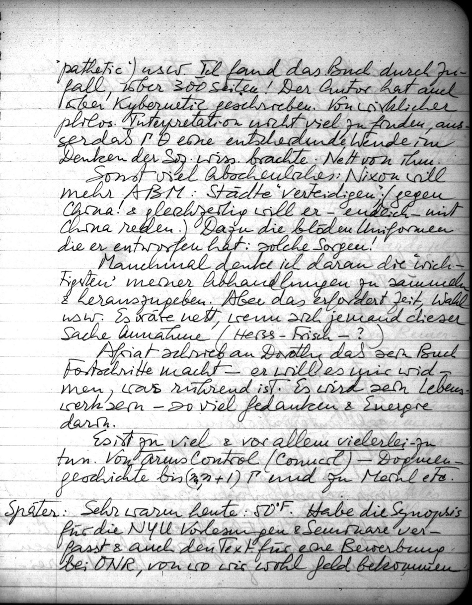 Sehr warm heute: 50° F. Habe die Synopsis für die NYU Vorlesungen & Seminare verfasst & auch den Text für eine Bewerbung bei ONR, von wo wir wohl Geld bekommen werden. Ich möchte etwas in NYU beitragen; viell. ein Center f. G ?, & ein Archiv (wie es in Wien auf meinen Wunsch hin organisiert wird) etc.