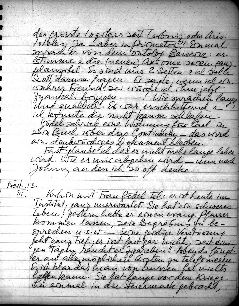 Vorhin mit Frau Gödel tel: er ist heute im Institut; ganz unerwartet. Sie hat ein schweres Leben; gestern hatte er einen evang. Pfarrer kommen lassen, sein Begräbnis zu besprechen u.s.w Seine geistige Verstörung geht ganz tief; er isst fast gar nicht, seit einigen Tagen raucht er Zigaretten!! Abends fängt er an allen möglichen Ärzten zu telefonieren. Es ist klar daß man von aussen her nichts helfen kann. Sie hat lange vor dem Kriege ihn einmal in die Steiermark gebracht, auf einer Alm & ihn von 48 Kilo auf 64 hinaufgebracht, aber Löffel für Löffel von demselben Teller gegessen, weil er damals glaubt er werde vergiftet. Und aus solchen Zuständen ist er herausgekommen & macht glänzende logische Untersuchungen. Aber ich zweifle daß es noch einmal gelingen wird.