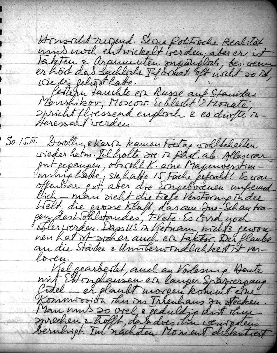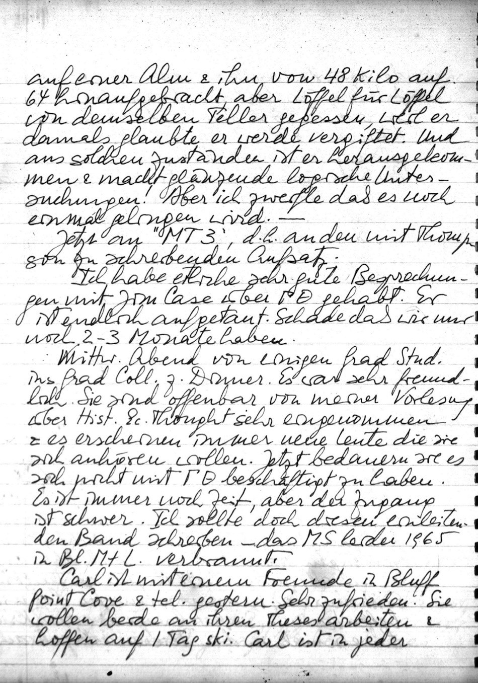 Mittw. Abend von einigen Grad. Stud. ins Grad Coll. z. Dinner. Es war sehr freundlich. Sie sind offenbar von meiner Vorlesung über Hist. Ec. Thought sehr eingenommen & es erscheinen immer neue Leute die sie sich anhören wollen. Jetzt bedauern sie es sich nicht mit G ? beschäftigt zu haben. Es ist immer noch Zeit, aber der Zugang ist schwer. Ich sollte doch diesen einleitenden Band schreiben das MS leider 1965 in Bl. Mt L. verbrannt.