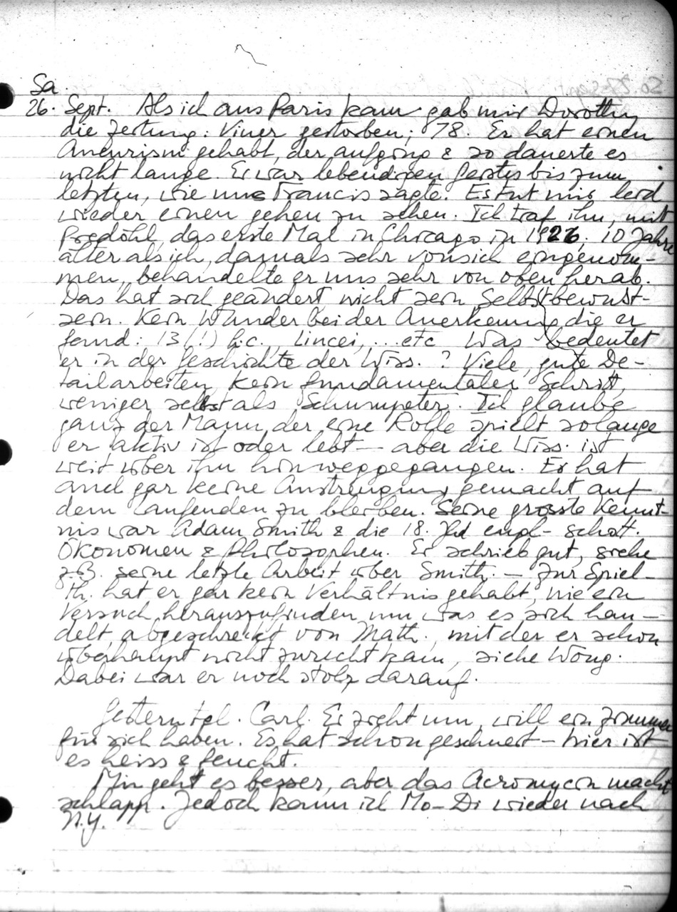 Als ich aus Paris kam gab mir Dorothy die Zeitung: Viner gestorben; 78. Er hat einen Aneurism gehabt, der aufging & so dauerte es nicht lange. Er war lebendigen Geistes bis zum letzten, wie uns Francis sagte. Es tut mir leid wieder einen gehen zu sehen. Ich traf ihn, mit Predohl, das erste Mal in Chicago in 1926; 10 Jahre älter als ich, damals sehr von sich eingenommen, behandelte er uns sehr von oben herab. Das hat sich geändert, nicht sein Selbstbewußtsein. Kein Wunder bei der Anerkennung die er fand: 13(!) h.c., Lincei, etc Was bedeutet er in der Geschichte der Wiss.? Viele, gute Detailarbeiten, kein fundamentaler Schritt, weniger selbst als Schumpeter. Ich glaube ganz der Mann der eine Rolle spielt solange er aktiv ist oder lebt aber die Wiss. ist weit über ihn hinweggegangen. Er hat auch gar keine Anstrengung gemacht auf dem Laufenden zu bleiben. Seine grösste Kenntnis war Adam Smith & die 18. Jhd. engl-schott. Ökonomen & Philosophen. Er schrieb gut, siehe z.B. seine letzte Arbeit über Smith. Zur Spielth. hat er gar kein Verhältnis gehabt, nie ein Versuch herauszufinden, um was sich handelt, abgeschreckt von Math., mit der er schon überhaupt nicht zurecht kam, siehe Wong. Dabei war er noch stolz darauf.