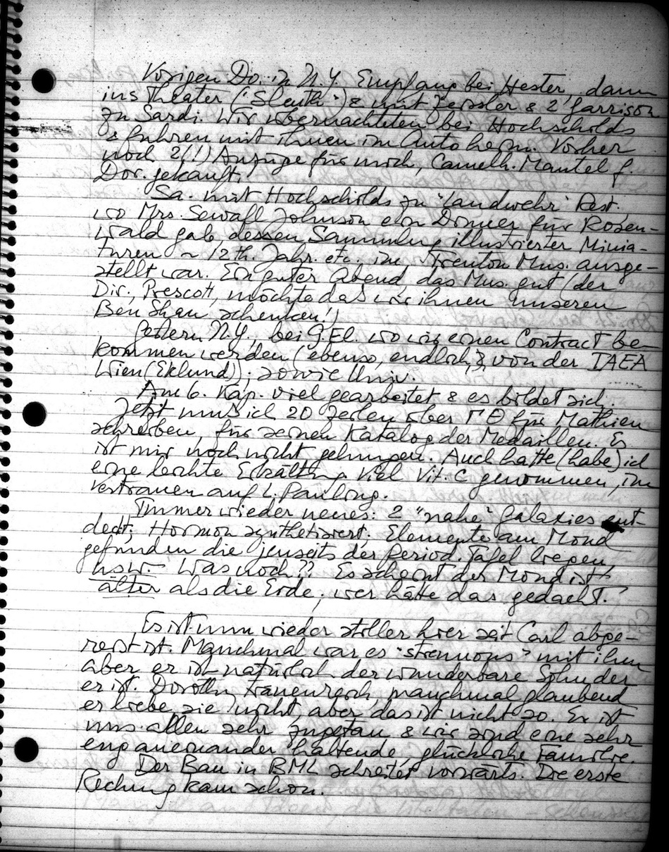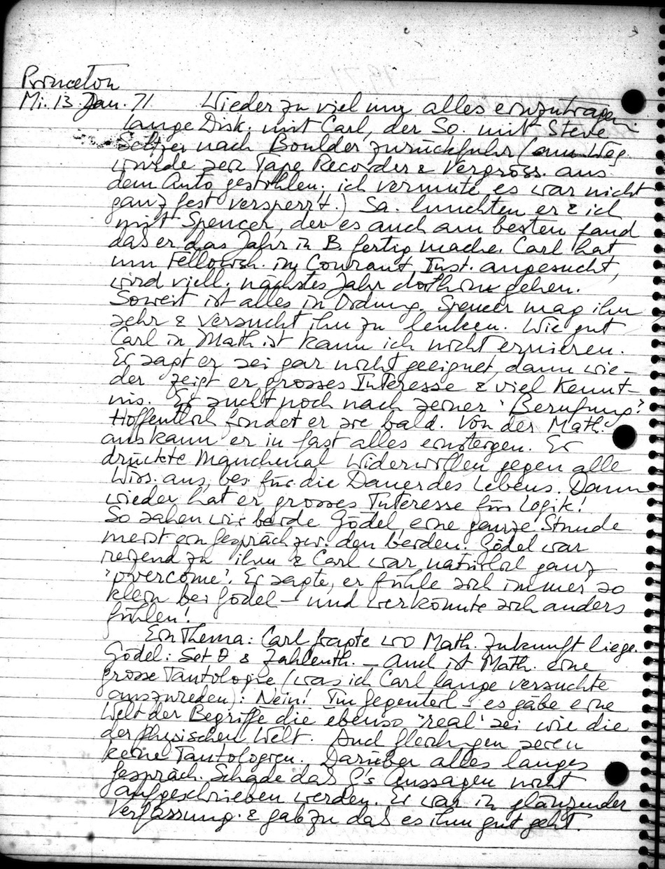 Wieder zu viel um alles einzutragen. Lange Disk. mit Carl, der So. mit Stente Seltzer nach Boulder zurückfuhr (am Weg wurde sein Tape Recorder & Vergröss. aus dem Auto gestohlen; ich vermute es war nicht ganz fest versperrt.) Sa. lunchten er & ich mit Spencer, der es auch am besten fand daß er das Jahr in B. fertig mache. Carl hat um Fellowsh. im Courant Inst. angesucht, wird viell. nächstes Jahr dorthin gehen. Soweit ist alles in Ordnung. Spencer mag ihn sehr & versucht ihn zu lenken. Wie gut Carl in Math ist kann ich nicht eruieren. Er sagt er sei gar nicht geeignet, dann wieder zeigt er grosses Interesse & viel Kenntnis. Er sucht noch nach seiner "Berufung". Hoffentlich findet er sie bald. Von der Math. aus kann er in fast alles einsteigen. Er drückte manchmal Widerwillen gegen alle Wiss. aus, bes. für die Dauer des Lebens. Dann wieder hat er grosses Interesse für Logik! So sahen wir beide Gödel, eine ganze Stunde meist ein Gespräch zw. den beiden. Gödel war reizend zu ihm & Carl war natürlich ganz "overcome". Er sagte, er fühle sich immer so klein bei Gödel und wer könnte sich anders fühlen"