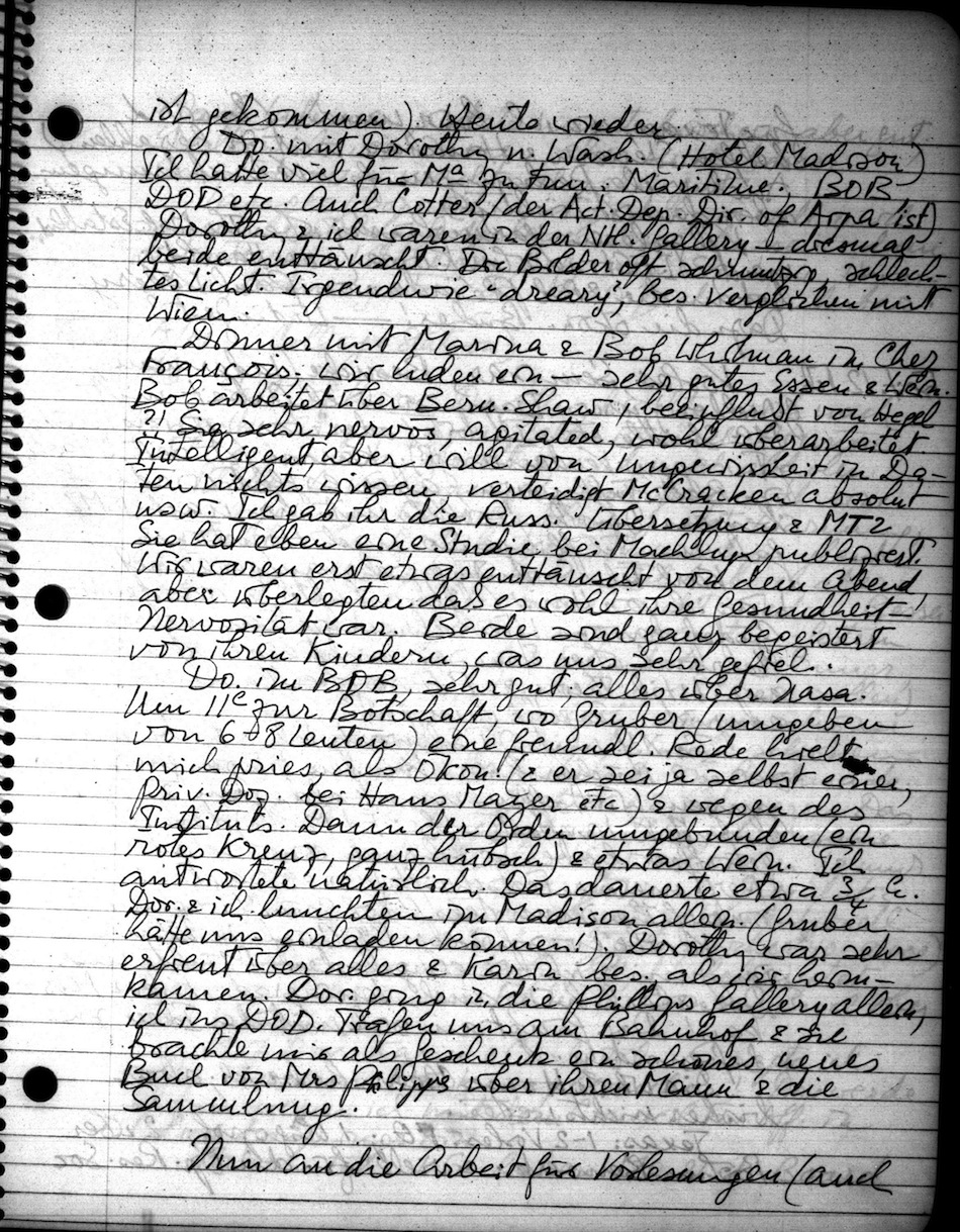 Do. mit Dorothy n. Wash. (Hotel Madison). Ich hatte viel für Ma zu tun: Maritime., BOB DOD etc. Auch Cotter (der Act. Dep. Dir. of Arpa ist) Dorothy, & ich waren in der Ntl. Gallery diesmal beide enttäuscht. Die Bilder oft schmutzig, schlechtes Licht. Irgendwie "dreary", bes. verglichen mit Wien.