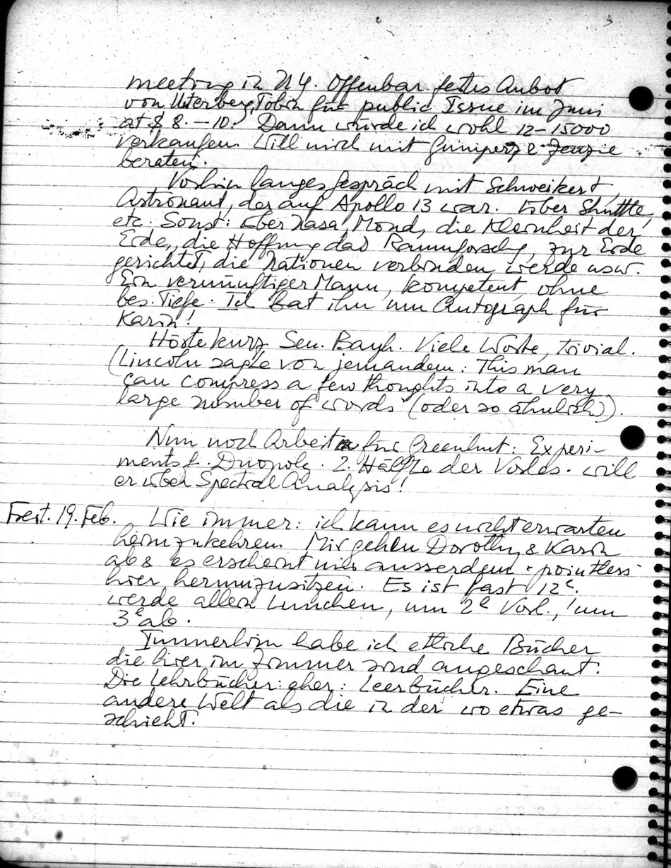 Vorhin lange Gespräch mit Schweikert, Astronaut, der auf Apollo 13 war. Über Shuttle, etc. Sonst: über Nasa, Mond, die Kleinheit der Erde, die Hoffnung daß Raumforschung, zur Erde gerichtet, die Nationen verbinden werde usw. Ein vernünftiger Mann, kompetent, ohne bes. Tiefe. Ich bat ihn um Autograph für Karin!