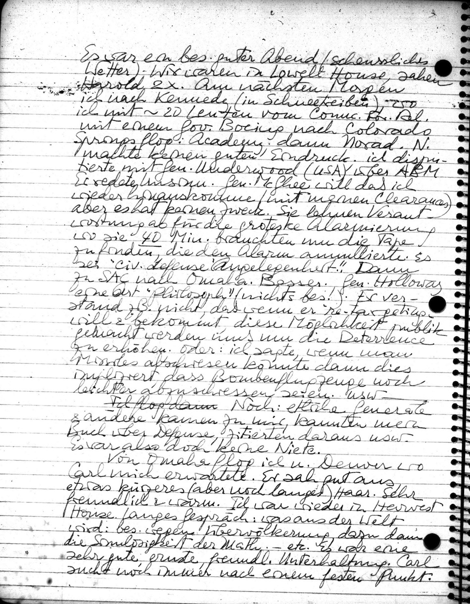 Shubik in N.Y. am 3. getroffen. Wir hoffen ihn nach NYU zu bringen. Es besteht eine gewisse Chance. Am Abend Dinner mit Dorothy in "4 Seasons", teuer & sehr gut. Es war ein bes. guter Abend (scheussliches Wetter). Wir waren in Lowelt House, sahen Harold 2 x. Am nächsten Morgen ich nach Kennedy (in Schneetreiben), wo ich mit ~ 20 Leuten vom Counc. For. Rel. mit einem Gov. Boeing nach Colorado Springs flog: Academy; dann Norad. N. machte keinen guten Eindruck; ich disputierte mit Gen. Underwood (USA) über ABM. Er redete Unsinn. Gen. McGhee will daß ich wieder hinauskomme (mit meinen Clearances) aber es hat keinen Zweck. Sie lehnen Verantwortung ab für die groteske Alarmierung wo sie 40 Min. brauchten um die Tape zu finden, die den Alarm annulierte. Es sei "civ. defense" Angelegenheit!! Dann zu SAC nach Omaha. Besser. Gen. Holloway eine Art "Philosoph" (nichts bes.!). Er verstand z.B. nicht, daß wenn er "re-targeting" will & bekommt diese Möglichkeit publik gemacht werden muß um die Deterence zu erhöhen. Oder: ich sagte, wenn man Missiles abschiessen könnte dann dies impliziert, dass Bombenflugzeuge noch leichter abzuschiessen seien. usw.