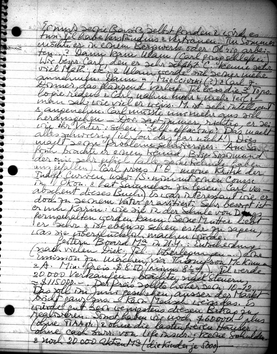 Gestern Board Ma in N.Y.: Entscheidung (nach vielen Disk., Tel., Überlegungen ) eine Emission zu machen, via Thompson McKinnan & A. Min. Preis $ 8.50 (minus 8½%). Ich werde 20 000 Verkaufen; brächte nach Steuern, $ 115 000,-. Der Preis sollte höher sein: 10-12. Das soll im Juni geschehen, ausser der Markt bricht ganz zus. Kein Mensch weiss das. Es würde gut sein wenigstens diesen Betrag zu realisieren. Sonst haben wir noch $ 60 000,- plus (ohne TIAA etc.) & ohne die lastenfreien Häuser, ohne cash surr. von Life insur.; keine Schulden & noch 20 000 Aktien Ma (Die Kinder je 5000).