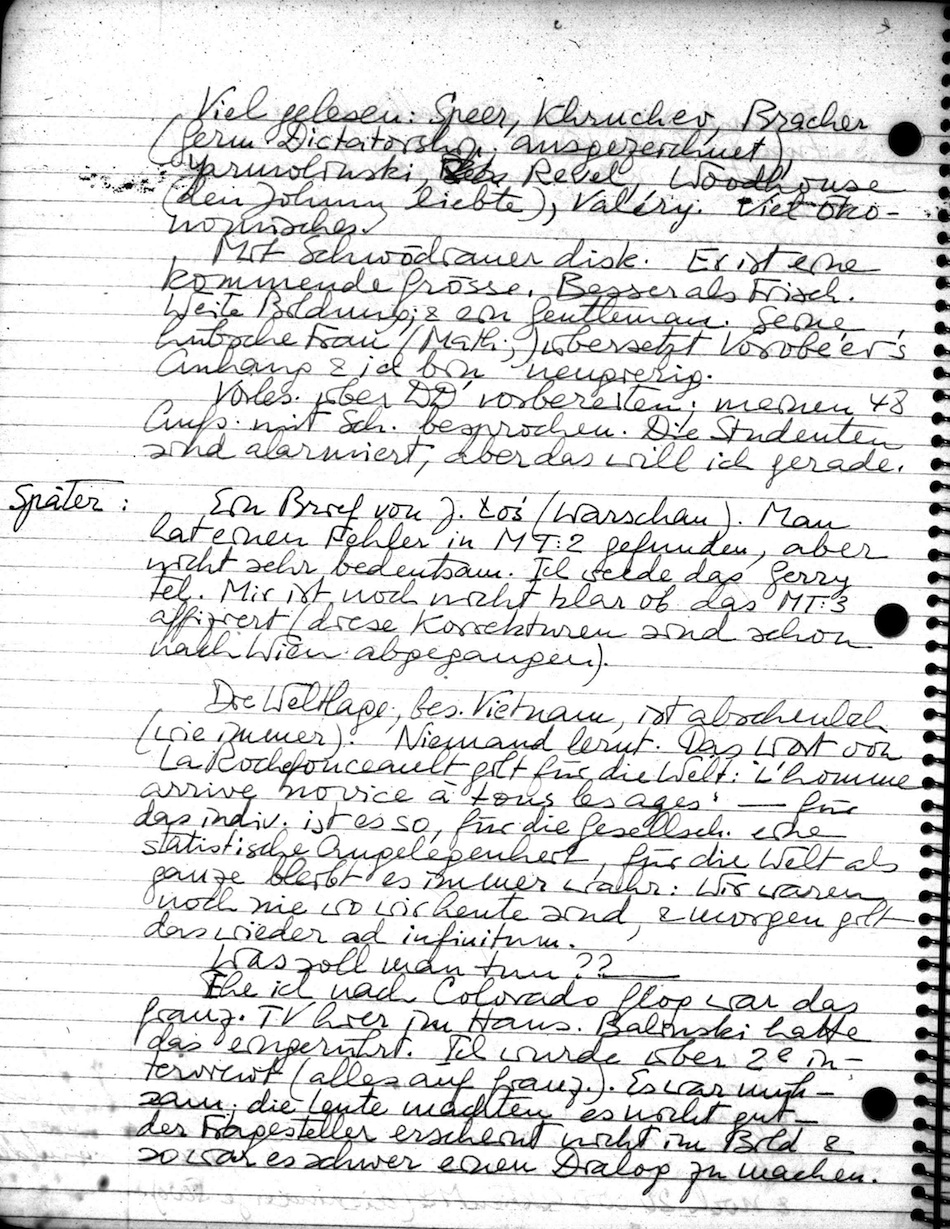 Ferner schrieb ich ein Memo für die Arms Control Ag. über ABM & placierung. Diskutiert lange mit Mr. Farley über Telephon. G. Smith flog gestern n. Wien. Natürlich wird alles keinen Einfluß haben; Farley gab mit allem recht was ich sagte, fühlte nur daß die Idee der "central anuihilation" unbehaglich sei genau was beabsichtigt ist. Ich sollte alles nochmals zus. fassen was von meinem Buche etc. übrig & lebendig ist.