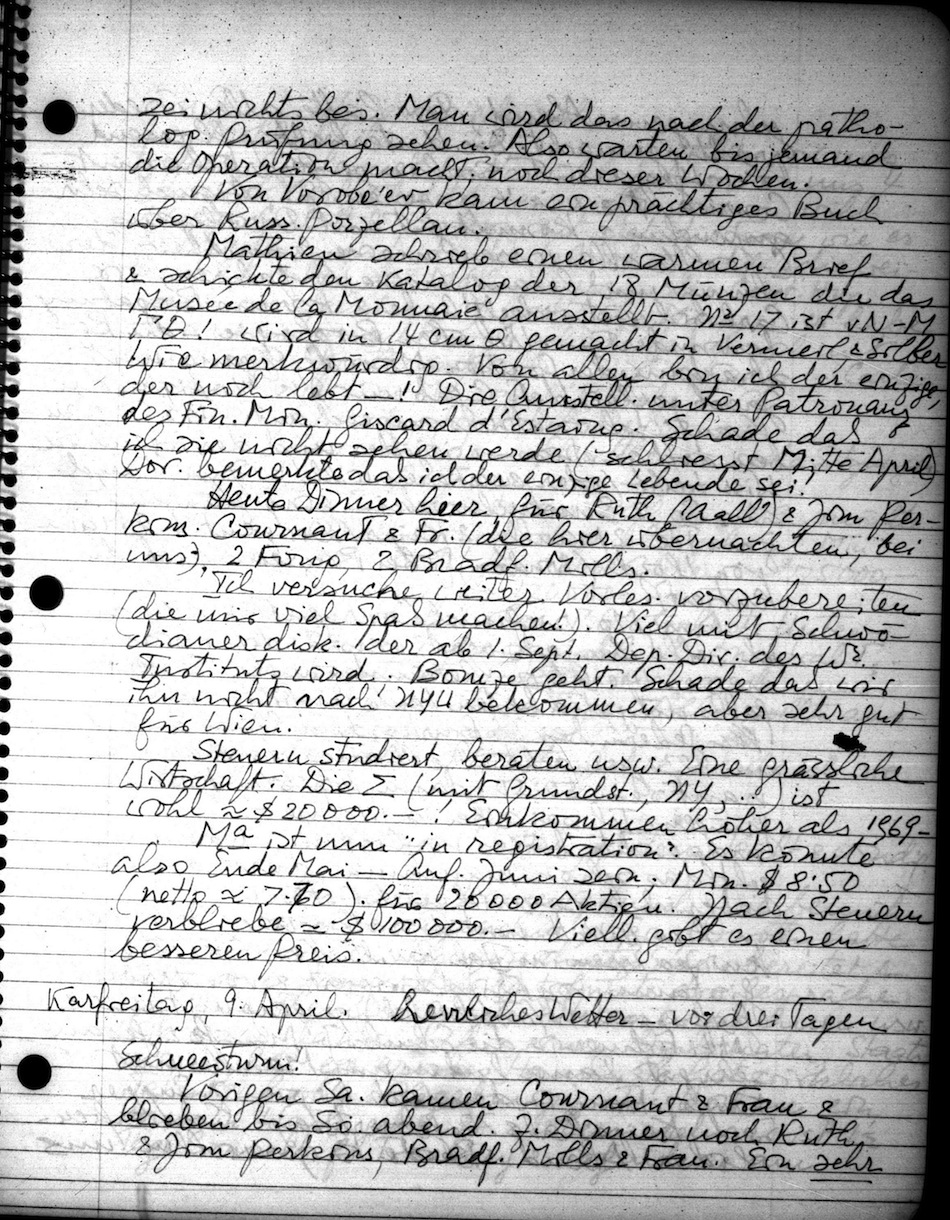 Am Mo. rief mich Cournant in NYU an: ich soll ihn ja sofort verständigen was mit meiner Operation herauskomme. Er werde, falls nötig, die besten Leute mobilisieren . Gestern bei Dr Burks, dem Chir. Es wird am 23. gemacht. Die Chance dass es malignant sei: 50:50; dann 40:60. Kein Vergnügen. Ich sei aber "a picture of health" & so mag nichts böses vorliegen. Natürlich geht das schon manchmal durch den Kopf, aber ich lasse mich nicht stören.