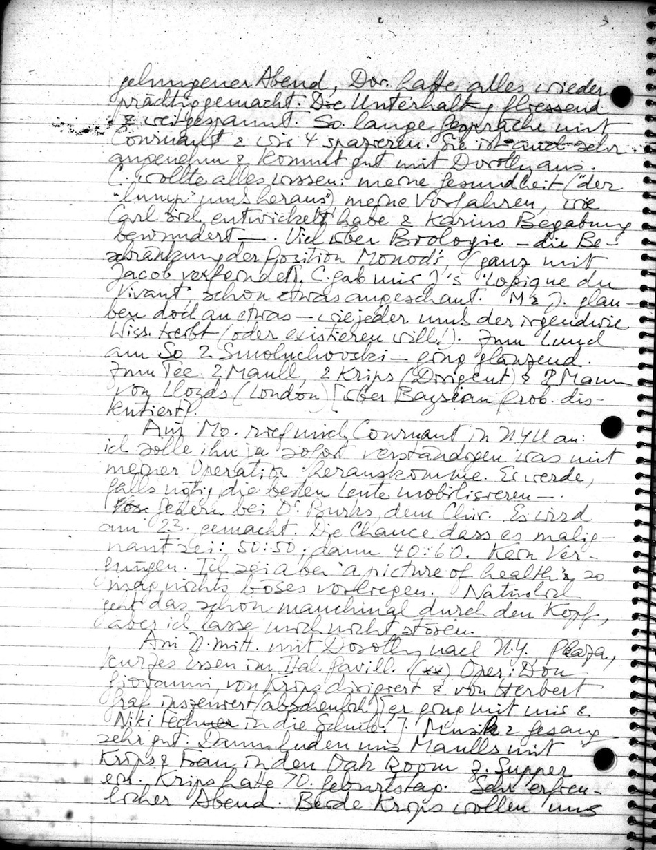 Vorigen Sa. kamen Cournant & Frau & blieben bis So. abend. Z. Dinner noch Ruth & Jim Perkins, Bradf. Mills & Frau. Ein sehr gelungener Abend, Dor. hatte alles wieder prächtig gemacht. Die Unterhaltung fliessend & weitgespannt. So. lange Gespräche mit Cournant & wir 4 spazieren. Sie ist auch sehr angenehm & kommt gut mit Dorothy aus. C. wollte alles wisse: meine Gesundheit ("der "lump" muß heraus"), meine Vorfahren, wie Carl sich entwickelt habe & Karins Begabung bewundert . Viel über Biologie die Beschränkung der Position Monod's (ganz mit Jacob verfeindet). C. gab mir J's "Logique du Vivant", schon etwas angeschaut. M & J. glauben doch an etwas wie jeder muß der irgendwie Wiss. treibt (oder existieren will!). Zum Lunch am So. 2 Smoluchowski ging glänzend. Zum Tee 2 Maull, 2 Krips (Dirigent) & 2 Mann von Lloyds (London) [über Baysian Prob. diskutiert].