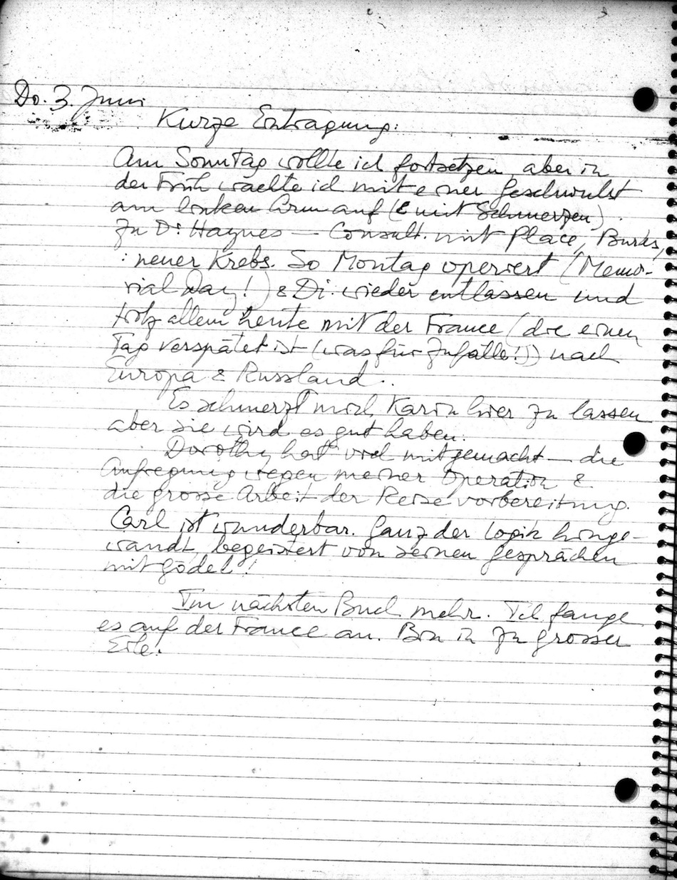 Am Sonntag wollte ich fortsetzen, aber in der Früh wachte ich mit einer Geschwulst am linken Arm auf (& mit Schmerzen). Zu Dr Haynes Consult. mit Place, Burks: neuer Krebs. So Montag operiert (Memorial Day!) & Di. wieder entlassen und trotz allem heute mit der France (die einen Tag verspätet ist (was für Zufälle!)) nach Europa & Russland.