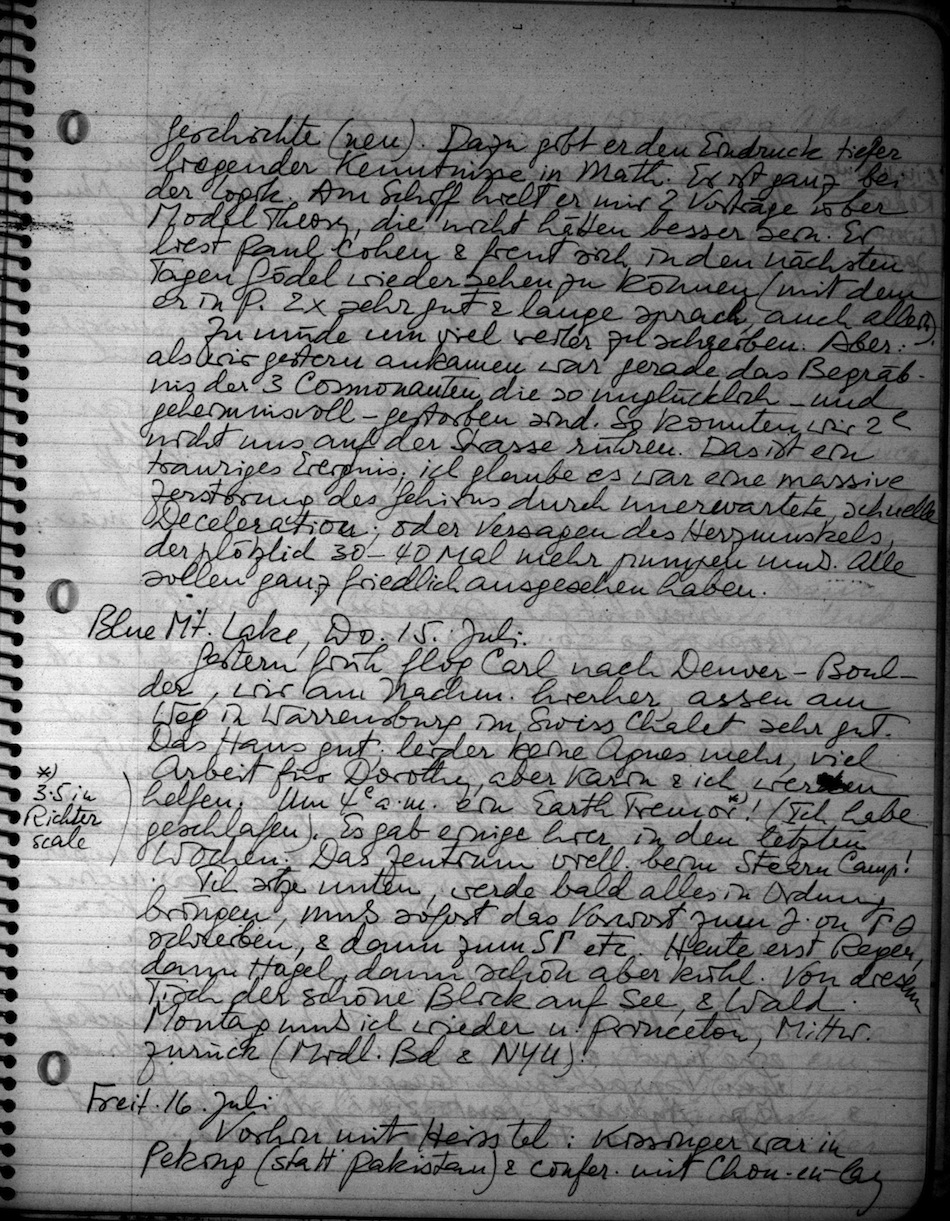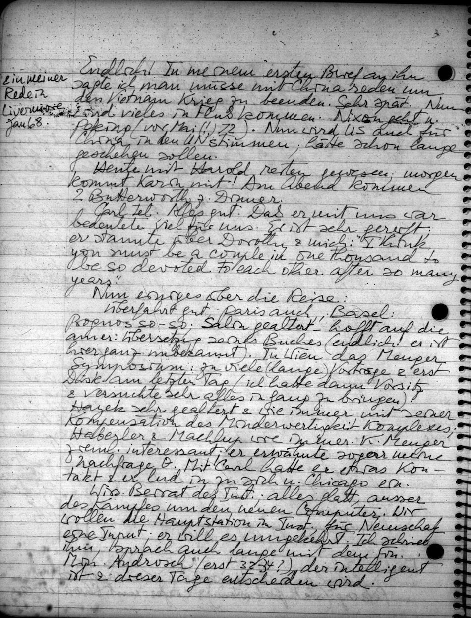 Vorhin mit Heiss tel: Kissinger war in Peking (statt Pakistan) & Conf. mit Chou-en-lay. Endlich! In meinem ersten Brief an ihn & in meiner Rede in Livermore Jan. 68 sagte ich man müsse mit China reden um den Vietnam Krieg zu beenden. Sehr spät. Nun wird vieles in Fluß kommen. Nixon geht n. Peking (vor Mai (!) 72). Nun wird US auch für China in den UN stimmen; hätte schon lange geschehen sollen.