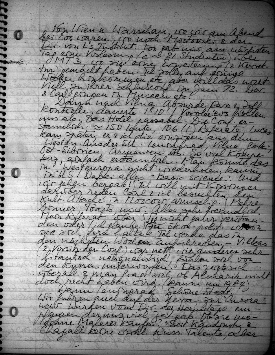 Dann nach Vilna. Absurde Pass & Zollkontrolle, dauer 1h10'! Vorobe'evs holten uns ab. Das Hotel passabel. Die Conf. erstaunlich: 150 Leute, 106 (!) Referate; Lucas kam später; er & ich die einzigen aus dem Westen. Aus der SU: Leningrad, Vilna, Gorki, Ost-Sibirien, Armenien etc. So viel Kompetenz, einfach erstaunlich. Man könnte das in Westeuropa nicht wiederholen; kaum in US! Dabei alles "basic science". Und wir gehen bergab! [Ich will mit Kissinger darüber reden. Carl & ich besuchten den Kult6. Attaché in Moscow: armselig.] Mehre Dinner, Toasts, usw. Alles sehr freundlich. Mein Referat über SG nicht ganz verstanden oder (ich glaube) allzu ökon-polit. wovon sie sich fern halten. Ich werde das in den nächsten Wochen aufschreiben. Vilkas (2. Vorsitz. der Conf.) war nett; wie anderes sehr litauisch-nationalistisch, fühlen sich von den Russen unterworfen. Das zeigte sich überall & man fragt sich, ob Almarik nicht doch recht haben wird (kaum um 1984).