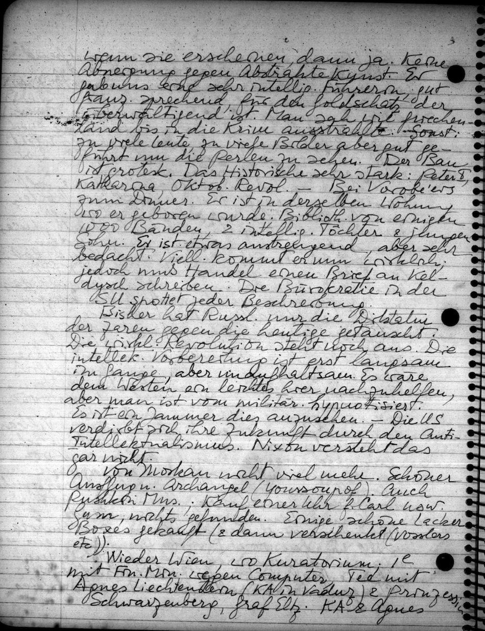 Dann Leningrad. Schöne Stadt. Wir fuhren auch auf der Neva, zur "Aurora" usw. Wurden vom Dir. der Hermitage empfangen, der uns viel Zeit gab. Ob sie moderne Malerei kaufen? Seit Kandinsky & Chagall keine wirkl. Russ. Talente, aber wenn sie erscheinen, dann ja. Keine Abneigung gegen Abstrakte Kunst. Er gab uns eine sehr intellig. Führerin, gut franz. sprechend, für den Goldschatz der überwältigend ist. Man sah wie Griechenland bis in die Krim ausstrahlte. Sonst: zu viele Leute, zu viele Bilder aber gut geführt um die Perlen zu sehen. Der Bau ist grotesk. Das Historische sehr stark: Peter I, Katharina, Oktob. Revol. Bei Vorobe'evs zum Dinner. Er ist in derselben Wohnung wo er geboren wurde. Biblioth. von einigen 1000 Bänden, 2 intellig. Töchter & jungen Sohn. Er ist etwas anstrengend, aber sehr bedacht. Viell. kommt er nun wirklich; jedoch muß Handel einen Brief an Keldysch schreiben. Die Bürokratie in der SU spottet jeder Beschreibung.
