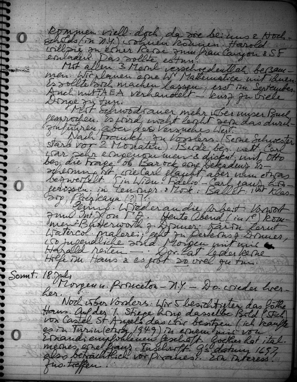 Nach Frankf. zu Vosslers. (Seine Schwester starb vor 2 Monaten). Beide bes. nett. Carl war sehr eingenommen & diskut. mit Otto bes. die Frage ob Barock eine Dekadenz Erscheinung ist, wie Carl glaubt, aber nun etwas bezweifelt [in Wien: Fidelio Carl ganz hingerissen; in Leningr. & Mosk.: Ballet: 1st klassig, Pliezkaya (?)].