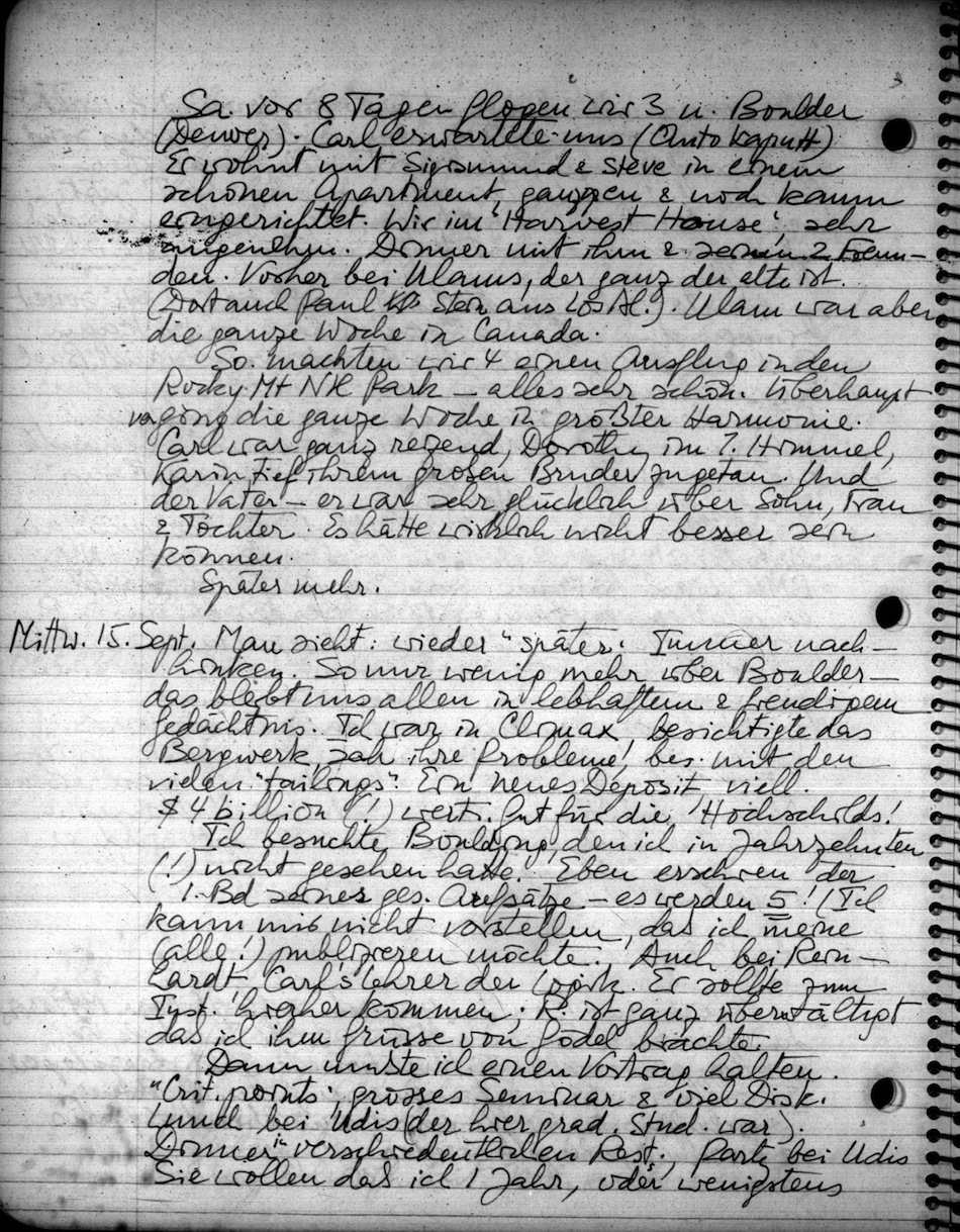 Sa. vor 8 Tagen flogen wir 3 n. Boulder (Denver). Carl erwartete uns (Auto kaputt). Er wohn mit Sigismund & Steve in einem schönen Apartment, ganz neu & noch kaum eingerichtet. Wir im "Harvest House", sehr angenehm. Dinner mit ihm & seinen 2 Freunden. Vorher bei Ulams, der ganz der alte ist. (Dort auch Paul Stein aus Los Al.). Ulam war aber die ganze Woche in Canada.