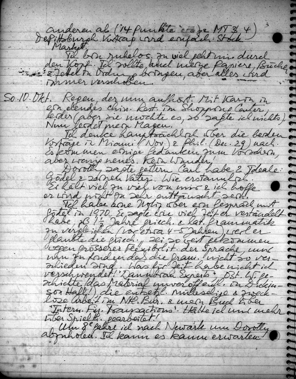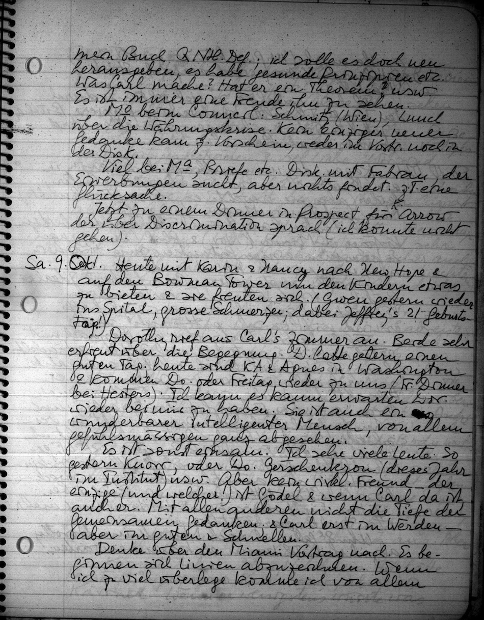 Es ist sonst einsam. Ich sehe viele Leute. So gestern Knorr, oder Do. Gerschenkron (dieses Jahr im Institut) usw. Aber kein wirkl. Freund der einzige (und welcher!) ist Gödel & wenn Carl da ist auch er. Mit allen anderen nicht die Tiefe der gemeinsamen Gedanken; & Carl erst im Werden aber im guten & Schnellen.