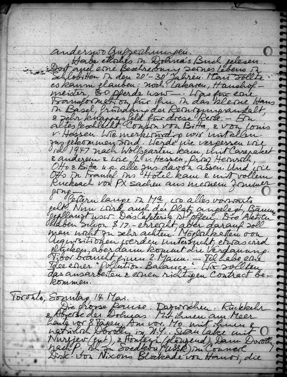 Habe etliches in Dohna's Buch gelesen. Dort auch eine Beschreibung seines Lebens in Schlobitten in den 20'-30' Jahren. Man sollte es kaum glauben; noch: Lakaien, Haushofmeister, 30 Pferde usw. . Was für eine Transformation für ihn in das kleine Haus in Basel, Gründung der Reinigungsanstalt, & sehr knappes Geld für diese Reise. Ein altes Geschlecht. Cousin von Bitta, & von Louis v. Hessen. Wie merkwürdig wir mit allen zus.gekommen sind. Werde nie vergessen wie ich 1947 nach Wolfsgarten kam, mit Carepaket & anderem & wie L. v. Hessen, Prinz Heinrich, Otto & Bitta u.a. alle zus. davon assen. Und wie Otto in Frankf. ins Hotel kam & mit vollem Rucksack von PX Sachen aus meinem Zimmer ging .
