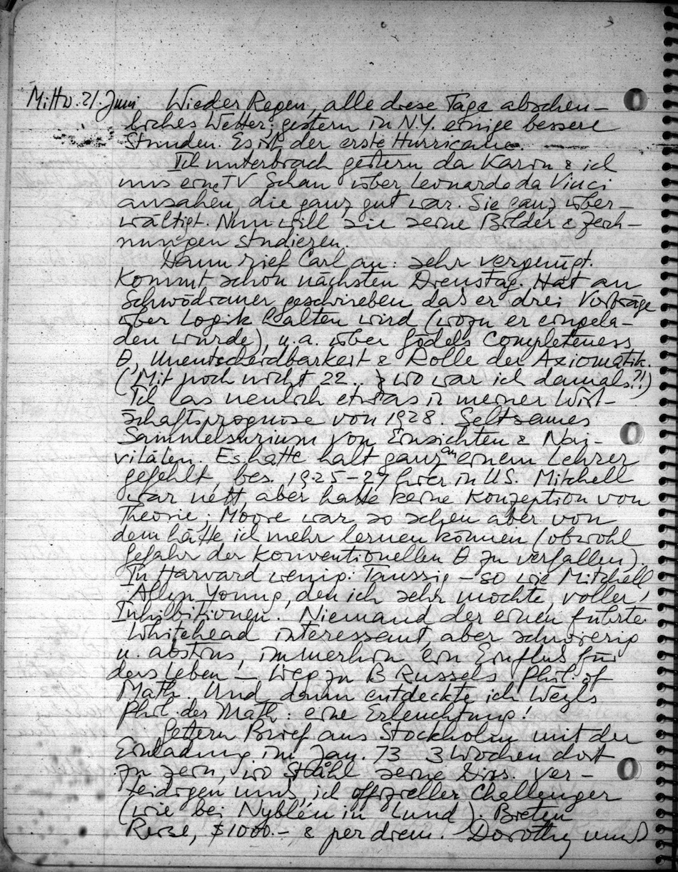 Dann rief Carl an: sehr vergnügt. Kommt schon nächsten Dienstag. Hat an Schwödianer geschrieben, daß er drei Vorträge über Logik halten wird (wozu er eingeladen wurde), u.a. über Gödels Completeness ?, Unentscheidbarkeit & Rolle der Axiomatik. (Mit noch nicht 22; wo war ich damals?!) Ich las neulich etwas in meiner Wirtschaftsprognose von 1928. Seltsames Sammelsurium von Einsichten & Naivitäten. Es hatte halt ganz an einem Lehrer gefehlt, bes. 1925-27 hier in US. Mitchell war nett, aber hatte keine Konzeption von Theorie; Moore war so scheu aber von dem hätte ich mehr lernen können (obwohl Gefahr der konventionellen ? zu verfallen). In Harvard wenig: Taussig so wie Mitchell, Allen Young, den ich sehr mochte, voller Inhilbitionen. Niemand der einen führte. Whitehead interessant, aber schwierig u. abstrus, immerhin ein Einfluß für das Leben Weg zu B. Russels Phil. of Math. Und dann entdeckte ich Weyls Phil. der Math: eine Erleuchtung!