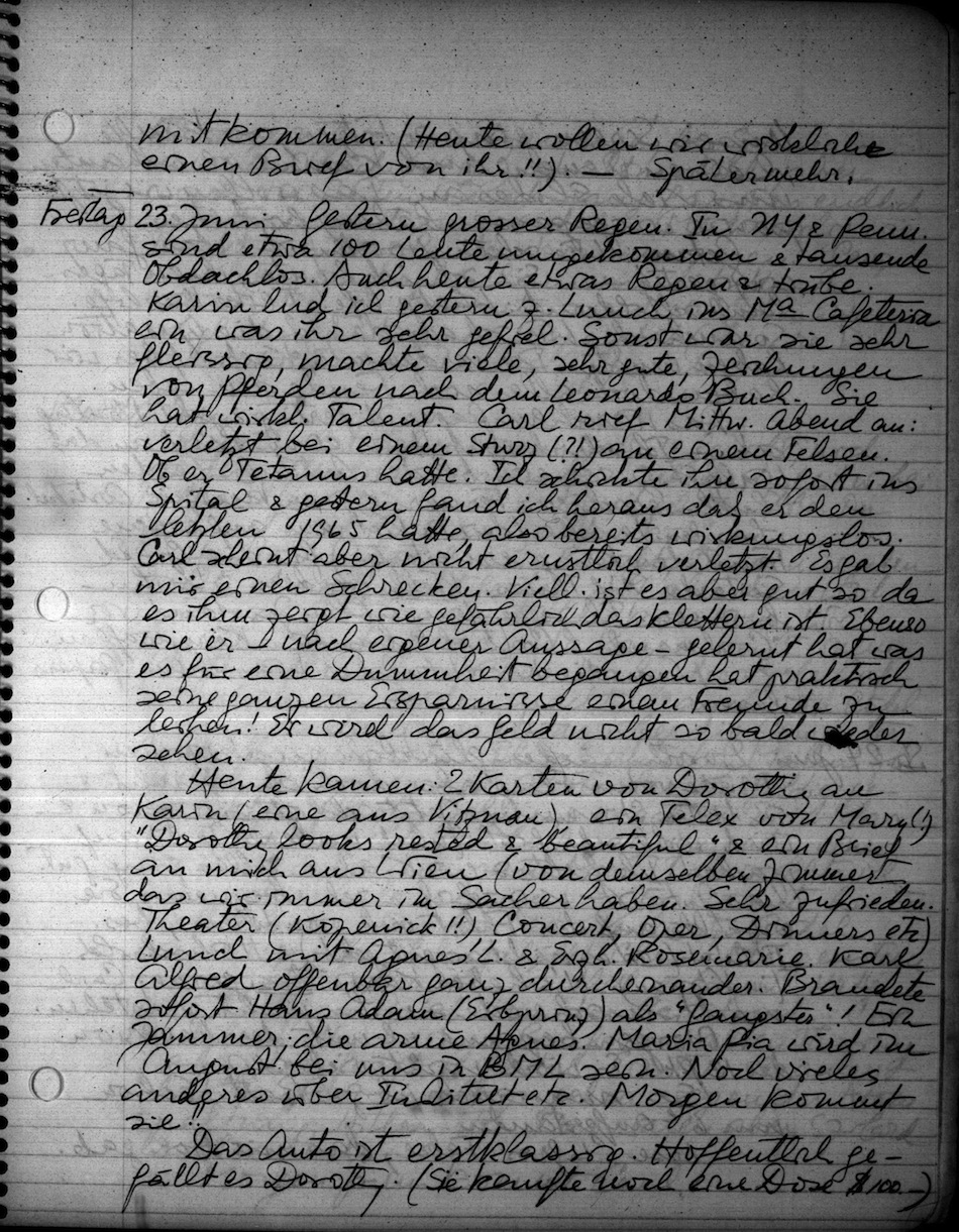 Gestern grosser Regen. In NY & Penn. sind etwa 100 Leute umgekommen & tausende Obdachlos. Auch heute etwas Regen & trübe. Karin lud ich gestern z. Lunch im Ma Cafeteria ein was ihr sehr gefiel. Sonst war sie sehr fleissig, machte viele, sehr gute, Zeichnungen von Pferden nach dem Leonardo Buch. Sie hat wirkl. Talent. Carl rief Mittw. Abend an: verletzt bei einem Sturz (?!) an einem Felsen. Ob er Tetanus hatte. Ich schickte ihn sofort ins Spital & gestern fand ich heraus daß er den letzten 1965 hatte, also bereits wirkungslos. Carl scheint aber nicht ernstlich verletzt. Es gab mir einen Schrecken. Viell. ist es aber gut so da es ihm zeigt wie gefährlich das Klettern ist. Ebenso wie er nach eigener Aussage gelernt hat was er für eine Dummheit begangen hat praktisch seine ganzen Ersparnisse einem Freunde zu leihen. Er wird das Geld nicht so bald wieder sehen.