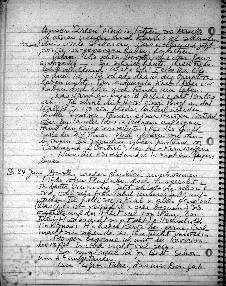 Das Warschau Paper ist fertig & geht Montag ab. Ich schrieb mit Heiss einen Brief an das Wall St. J. wo ein blöder Artikel über den Shuttle erschien. Ferner einen kurzen Artikel über Gen. Lavelle (der in Vietnam auf eigen Faust den Krieg erweiterte) für die Gi-Ed Seite der N.Y. Times. Viell. werden sie ihn bringen. Ich zeige den üblen Zustand von "Command & Control", bes. für Kernwaffen.