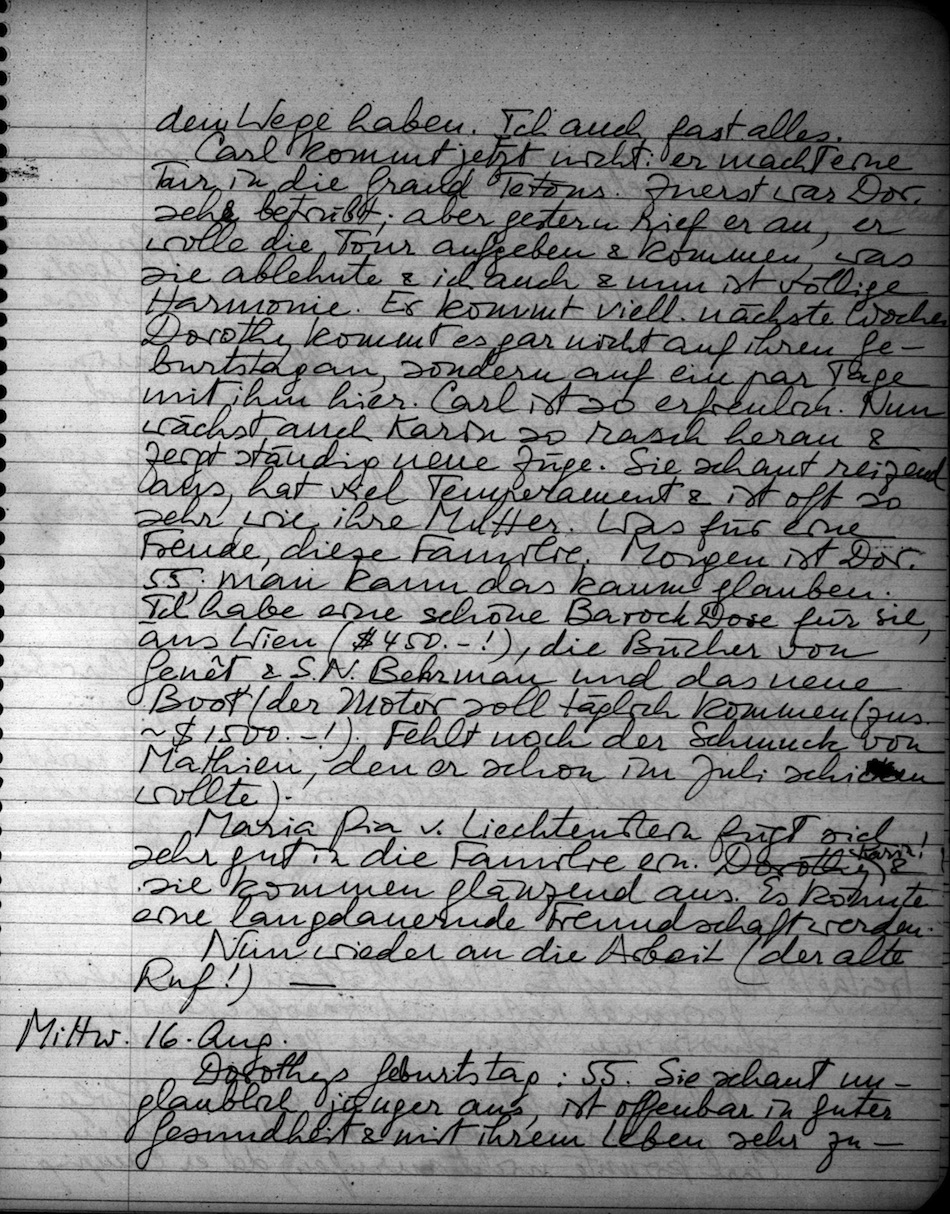 Carl kommt jetzt nicht: er macht eine Tour in die Grand Tetons. Zuerst war Dor. sehr betrübt; aber gestern rief er an, er wolle die Tour aufgeben & kommen, was sie ablehnte & ich auch & nun ist völlige Harmonie. Er kommt viell. nächste Woche. Dorothy kommt es gar nicht auf ihren Geburtstag an, sondern auf ein par Tage mit ihm hier. Carl ist so erfreulich. Nun wächst auch Karin so rasch heran & zeigt ständig neue Züge. Sie schaut reizend aus, hat viel Temperament & ist oft so sehr wie ihre Mutter. Was für eine Freude, diese Familie. Morgen ist Dor. 55; man kann das kaum glauben. Ich habe eine schöne Barock Dose für sie, aus Wien ($ 450,-!), die Bücher von Genêt & S.N. Behrman und das neue Boot (der Motor soll täglich kommen (zus. ~ $ 1500,-!). Fehlt noch der Schmuck von Mathien, den er schon im Juli schicken wollte).
