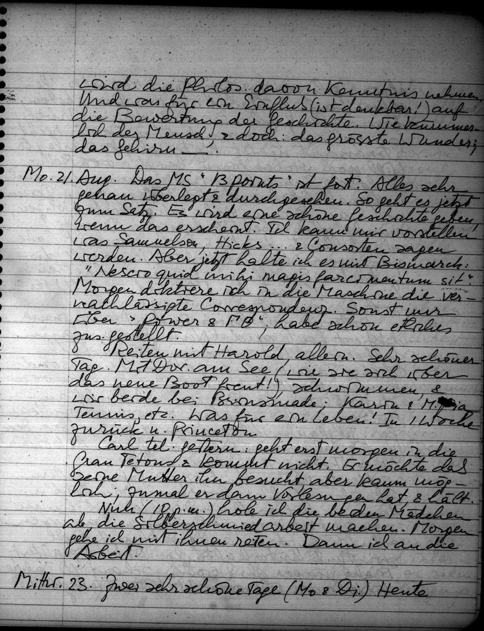 Eben kommen meine weibl. Fam. von Harold zurück wo sie Waterski waren. Gestern Party hier 20 . Mrs Ohnstead & Töchter, Walter & Key H., Harrison Salsbury & Fr. (waren 1 Mon. in China), Mary, Train, etc. etc. Viel Arbeit f. Dor. aber sie tat das gerne & es lohnt sich.