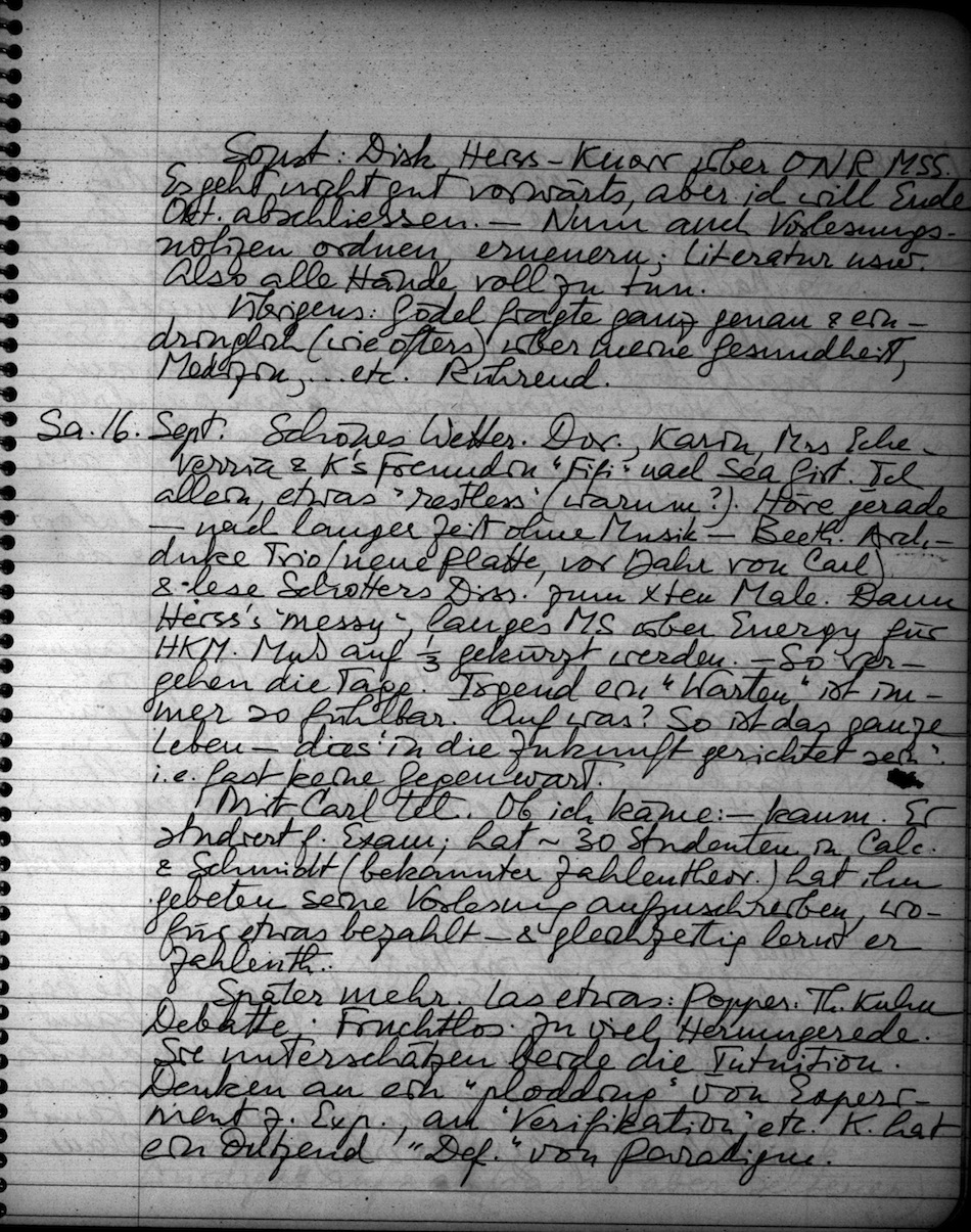 Sonst: Disk. Heiss-Knorr über ONR MSS. Es geht nicht gut vorwärts, aber ich will Ende Okt. abschliessen. Nun auch Vorlesungsnotizen ordnen, erneuern; Literatur usw. Also alle Hände voll zu tun.