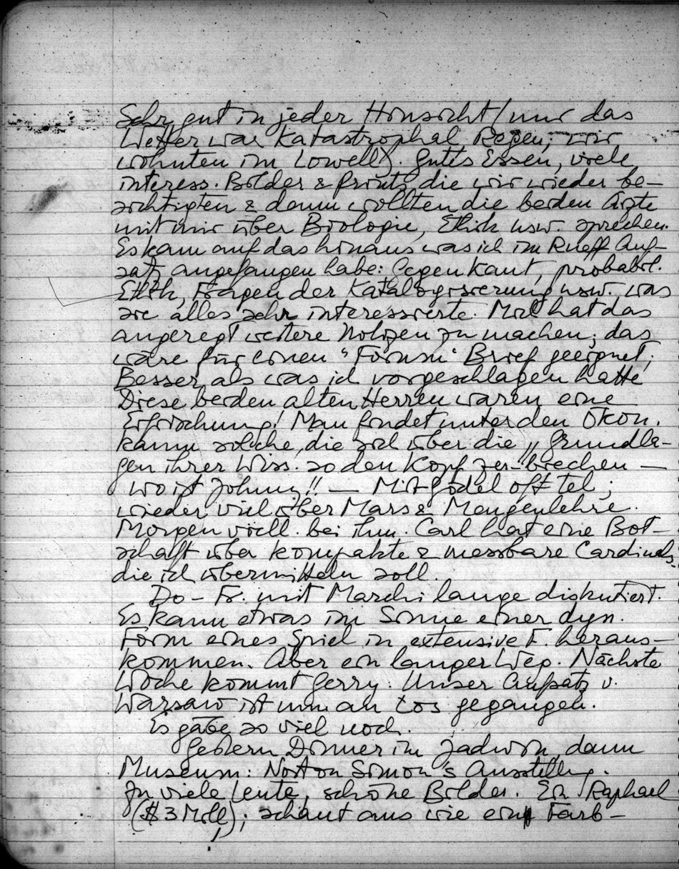 Do. Dinner bei Cornands; noch Dr Richards & Fr., ebenfalls Nobelprice (mit C.). Sehr gut in jeder Hinsicht (nur das Wetter war Katastrophal, Regen; wir wohnten im Lowell). Gutes Essen, viele interess. Bilder & Prints die wir wieder besichtigten & dann wollten die beiden Ärzte mit mir über Biologie, Ethik usw. sprechen. Es kam auf das hinaus was ich im Rueff Aufsatz angefangen habe: Gegen Kant, probabil. Ethik, Fragen der Katalogisierung usw. was sie alles sehr interessierte. Mich hat das angeregt weitere Notizen zu machen; das wäre für einen "Forum" Brief geeignet; Besser als was ich vorgeschlagen hatte. Diese beiden alten Herren waren eine Erfrischung! Man findet unter den Ökon. kaum solche, die sich über die // Grundlagen ihrer Wiss. so den Kopf zer-brechen wo ist Johnny!! Mit Gödel oft tel; wieder viel über Mars & Mengenlehre. Morgen viell. bei ihm. Carl hat eine Botschaft über kompakte & messbare Cardinals, die ich übermitteln soll.