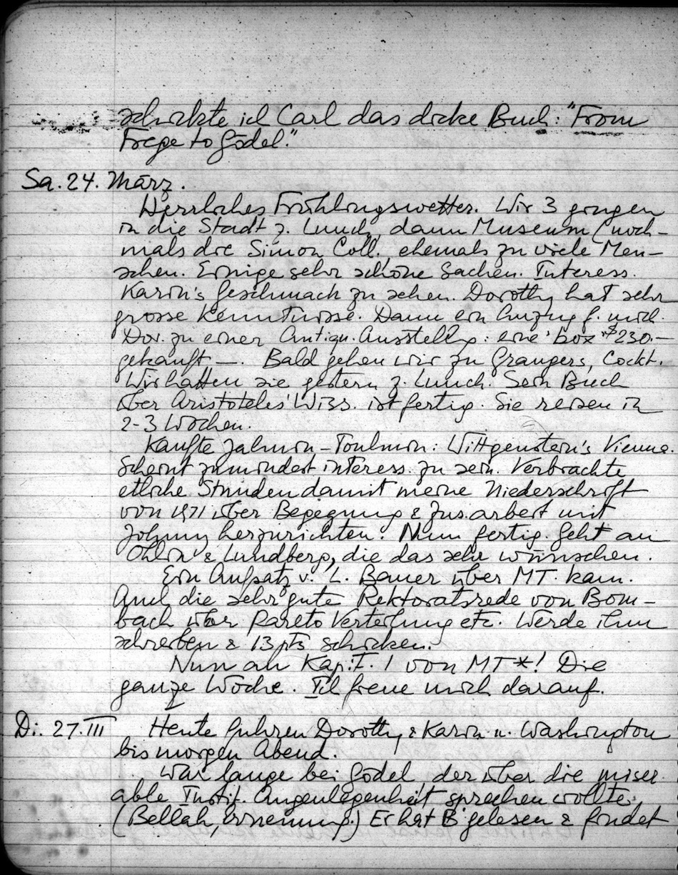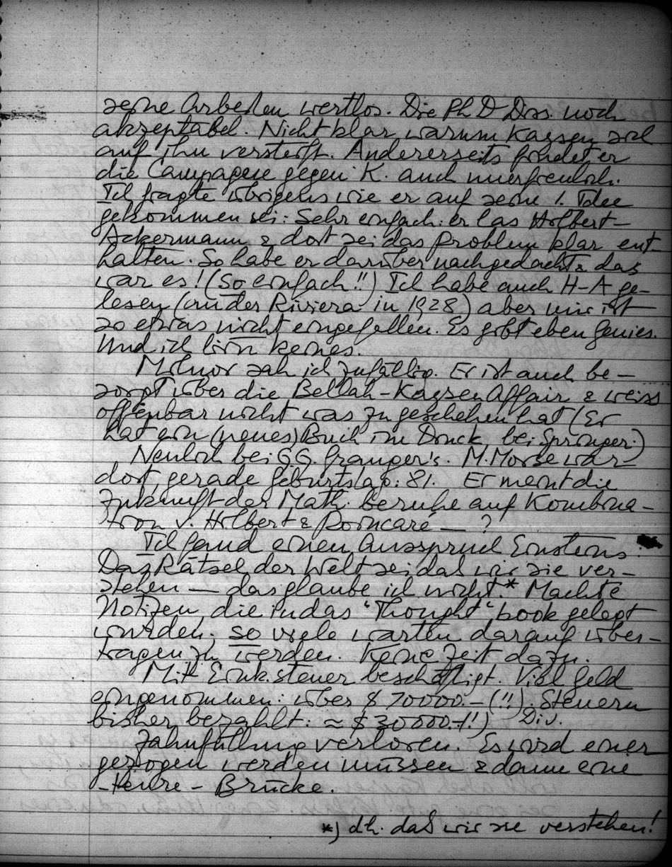 War lange bei Gödel, der über die miserable Instit. Angelegenheit sprechen wollte. (Bellah, Ernennung.) Er hat B. gelesen & findet seine Arbeiten wertlos. Die PhD Diss. noch akzeptabel. Nicht klar warum Kaysen sich auf ihn versteift. Andererseits findet er die Champagne gegen K. auch unerfreulich. Ich fragte übrigens wie er auf seine 1. Idee gekommen sei. Sehr einfach: er las Hofbert-Ackermann & dort sei das Problem klar enthalten. So habe er darüber nachgedacht & das war es! (So einfach!!) Ich habe auch H-A gelesen (an der Riviera in 1928) aber mir ist so etwas nicht eingefallen. Es gibt eben Genies. Und ich bin keines.