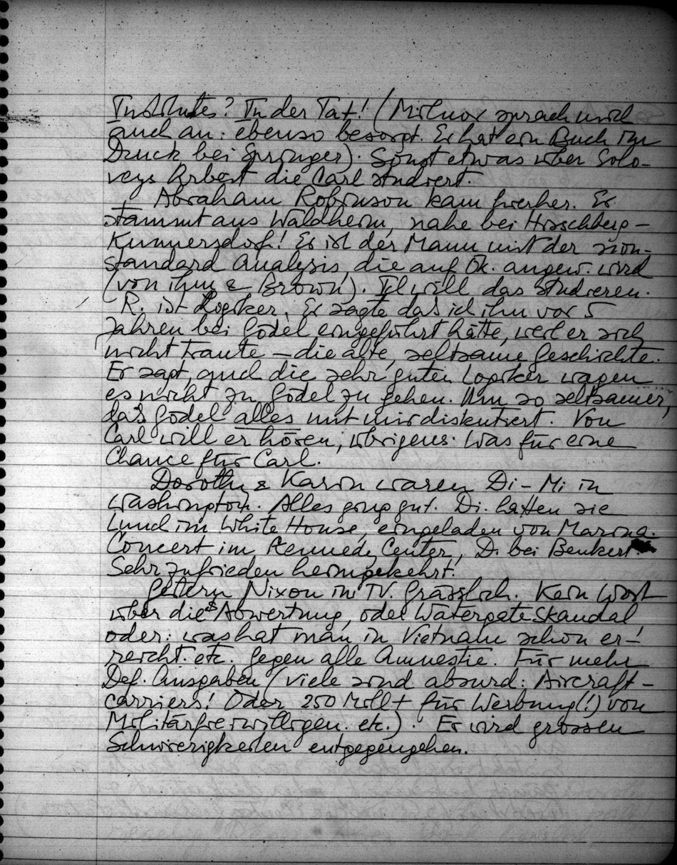 Abraham Robinson kam hierher. Er stammt aus Waldheim, nahe bei Hirschberg-Kummersdorf! Er ist der Mann mit der nonstandard Analysis, die auf Ök. angew. wird (von ihm & Brown). Ich will das studieren. R. ist Logiker. Er sagte daß ich ihn vor 5 Jahren bei Gödel eingeführt hätte, weil er sich nicht traute die alte, seltsame Geschichte. Er sagt auch die sehr guten Logiker wagen es nicht zu Gödel zu gehen. Um so seltsamer, daß Gödel alles mit mir diskutiert. Von Carl will er hören, übrigens. Was für eine Chance für Carl.