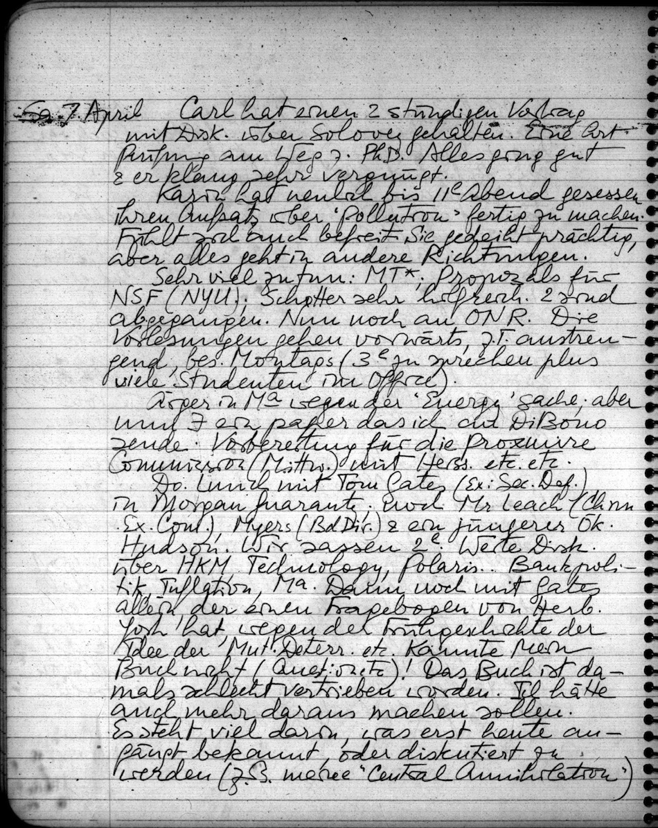Do. Lunch mit Tom Gates (Ex: Sec. Def.) in Morgan Guaranty; noch Mr. Leach (Chm. Ex. Cont.), Myers (Bd Dir.) & ein jüngerer Ök. Hudson. Wir sassen 2h. Weite Disk. über HKM, Technology, Polaris. Bankpolitik, Inflation, Ma. Dann noch mit Gates allein, der einen Fragebogen von Herb. York hat, wegen der Frühgeschichte der Idee der Mut. Deterr. etc. Kannte mein Buch nicht (Question etc)! Das Buch ist damals schlecht vertrieben worden. Ich hätte auch mehr daraus machen sollen. Es steht viel darin, was erst heute anfängt bekannt, oder diskutiert zu werden (z.B. meine "Central Anuihilation"). Ich hätte mit dem Gelde von Gen. Johnson ein Exempl. an jeden Sen. & Congr. Man etc. schicken sollen. So hat mich aber Sam Barton ganz falsch beraten mit dem total versagten publ. Agenten. Schade.