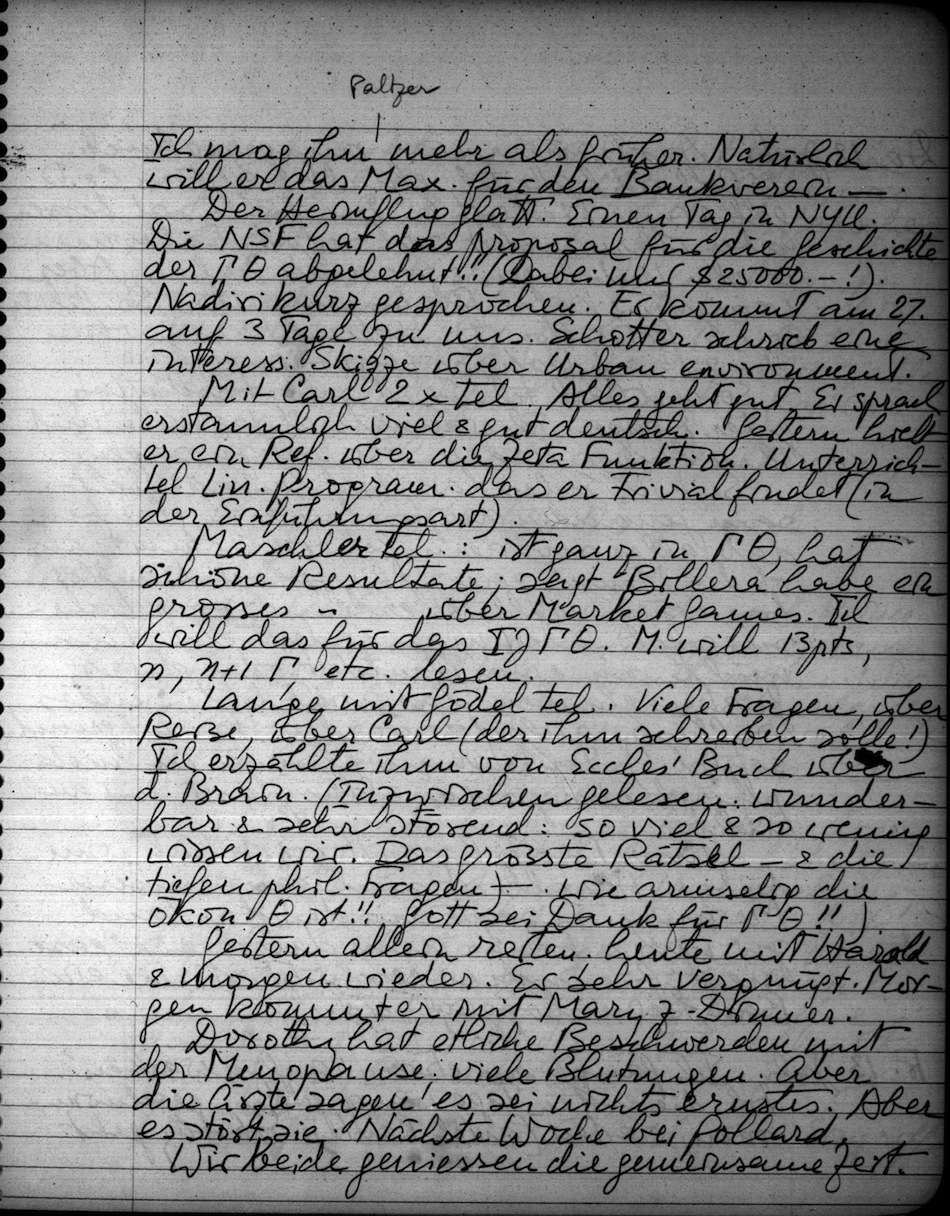 Lange mit Gödel tel. Viele Fragen, über Reise, über Carl (der ihm schreiben solle!). Ich erzählte ihm von Eccles' Buch über d. Brain. (Inzwischen gelesen: wunderbar & sehr störend: so viel & so wenig wissen wir. Das grösste Rätsel & die tiefen phil. Fragen wie armselig die ökon. ? ist!! Gott sei Dank für G ?!!).