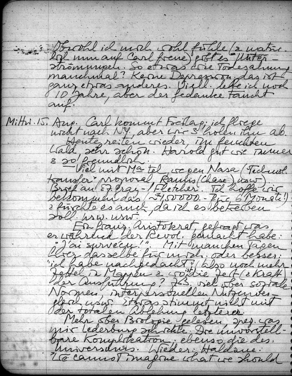 Hier wurde ich a.m. unterbrochen. Nun ist es 8:30 p.m. Mit Dor. geschwommen, gegen Abend spazieren, sonst Briefe, nachgedacht usw. Manches klärt sich. Nun die 2 nächsten Sachen: über Johnny (für Spanien) & eine Einleitung zum Neudruck der W.progr. (1928!). Beides nicht leicht, sollte aber vor Labor day fertig werden.? Lese verschiedenes, z.B. John Brooks neue Untersuchungen (im N Yorker) über Börsenspekulation, etwas über Währung etc. Ein 6 Seiten langer Brief von R.W. Shephard. Es ist ihm schlimm gegangen (Arthrytis), aber wiss. gat. Er ist mir sehr zugetan & ich schätze ihn sehr.