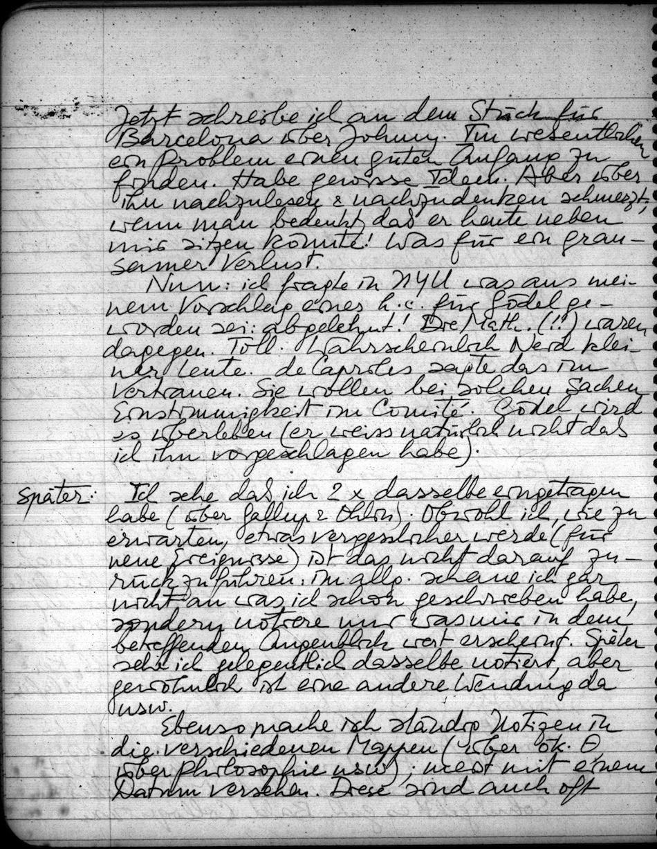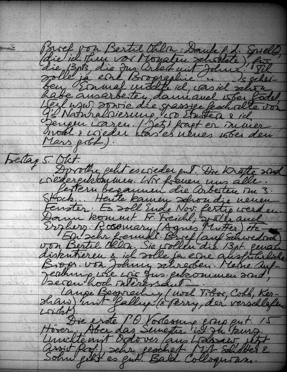 Die erste G ? ging gut. 15 Hörer. Aber das Semester ist zu kurz. Lunchte mit Ordover (aus Warsaw, jetzt Assist. Prof.), sehr gescheit. Mit Schotter & Sohn geht es gut. Bald Colloquium. Jetzt schreibe ich an dem Stück für Barcelona über Johnny. Im wesentlichen ein Problem einen guten Anfang zu finden. Habe gewisse Ideen. Aber über ihn nachzulesen & nachzudenken schmerzt, wenn man bedenkt, daß er heute neben mir sitzen könnte! Was für ein grausamer Verlust.