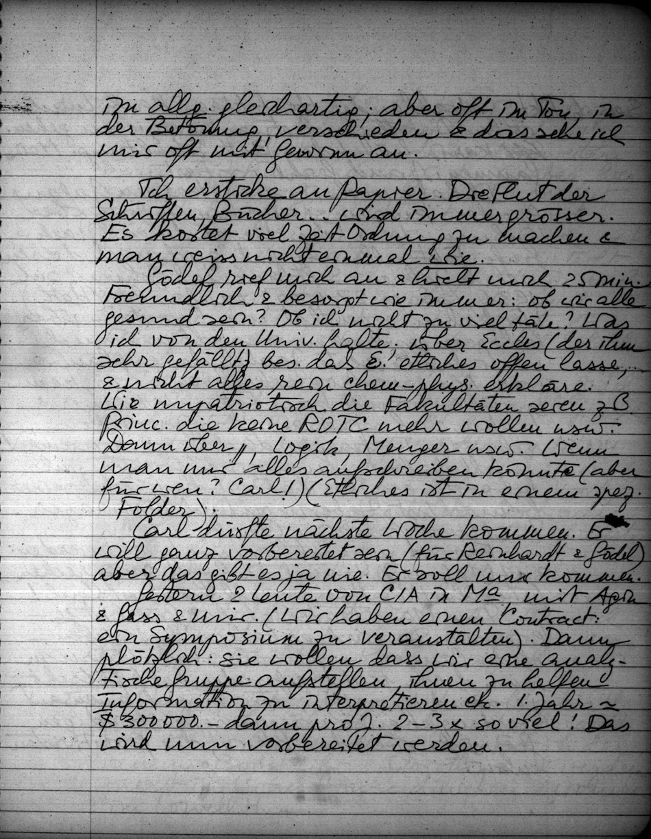Gestern 2 Leute von CIA in Ma, mit Agin & Gass & mir. (Wir haben einen Contract: ein Symposium zu veranstalten). Dann plötzlich: sie wollen dass wir eine analytische Gruppe aufstellen, ihnen zu helfen Information zu interpretieren etc. 1. Jahr $ 300 000,- dann pro J. 2-3 x so viel! Das wird nun vorbereitet werden.