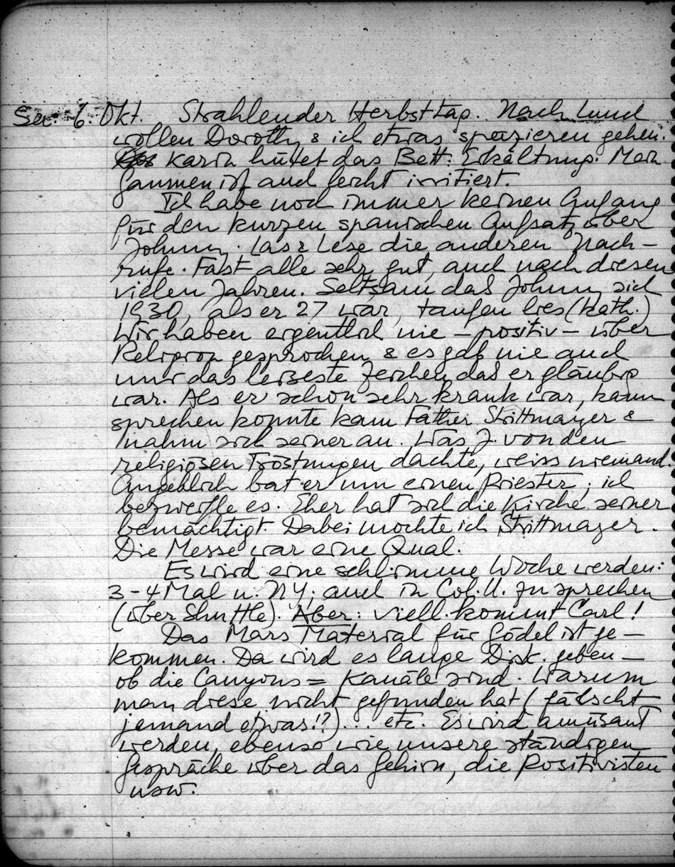 Ich habe noch immer keinen Anfang für den kurzen spanischen Aufsatz über Johnny. Las & Lese die anderen Nachrufe. Fast alle sehr gut, auch nach diesen vielen Jahren. Seltsam daß Johnny sich 1930, als er 27 war, taufen lies (kath.) Wir haben eigentlich nie positiv über Religion gesprochen & es gab nie auch nur das leiseste Zeichen, daß er gläubig war. Als er schon sehr krank war, kaum sprechen konnte kam Father Strittmayer & nahm sich seiner an. Was J. von den religiösen Tröstungen dachte, weiss niemand. Angeblich bat er um einen Priester; ich bezweifle es. Eher hat sich die Kirche seiner bemächtigt. Dabei mochte ich Strittmayer. Die Messe war eine Qual.