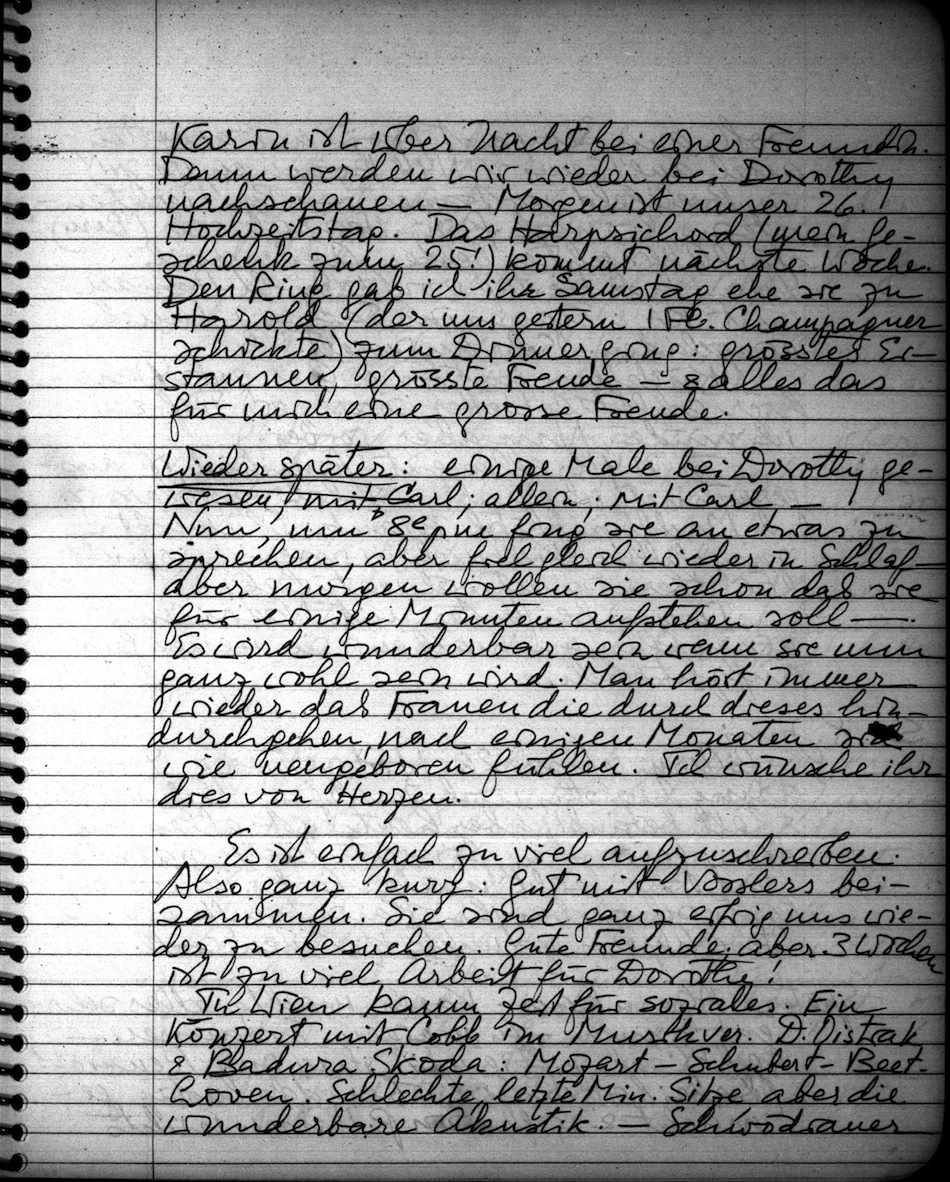 In Wien kaum Zeit für soziales. Ein Konzert mit Cobb im Musikver. D. Distrak & Badura Skoda: Mozart Schubert Beethoven. Schlechte, letzte Min. Sitze, aber die wunderbare Akustik. Schwödianer soll am Semperit Proj. mitarbeiten, auch auf 1 Sem. n. NYU kommen, (n, n+1) in Bielefeld vortragen . Bei Liechtensteins, wo noch Prinz Heinrich war (Bern). Karl Alfr. geht es besser, Agnes auch. Dann am Freitag von Leopold Hanau mit KA & Agnes ins Sacher z. Lunch eingeladen. Sehr animiert.