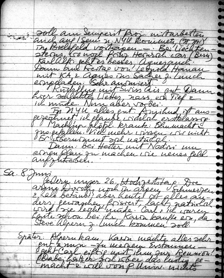 Später: mehrfach bei ihr gewesen. Aber sie ist immer noch unter dem Einfluß der Anestesy, bekam eine neue Schmerzstillende Injektion. Carl & ich gehen jetzt zum Nachtmahl (Chin. Res. bei Ma), Karin ist über Nacht bei einer Freundin. Dann werden wir wieder bei Dorothy nachschauen. Morgen ist unser 26. Hochzeitstag. Das Harpsichord (mein Geschenkt zum 25!) kommt nächste Woche. Den Ring gab ich ihr Samstag ehe sie zu Harold (der uns gestern 1 Fl. Champagner schickte) zum Dinner ging. Grösstes Erstaunen, grösste Freude & alles das für mich eine grosse Freude.