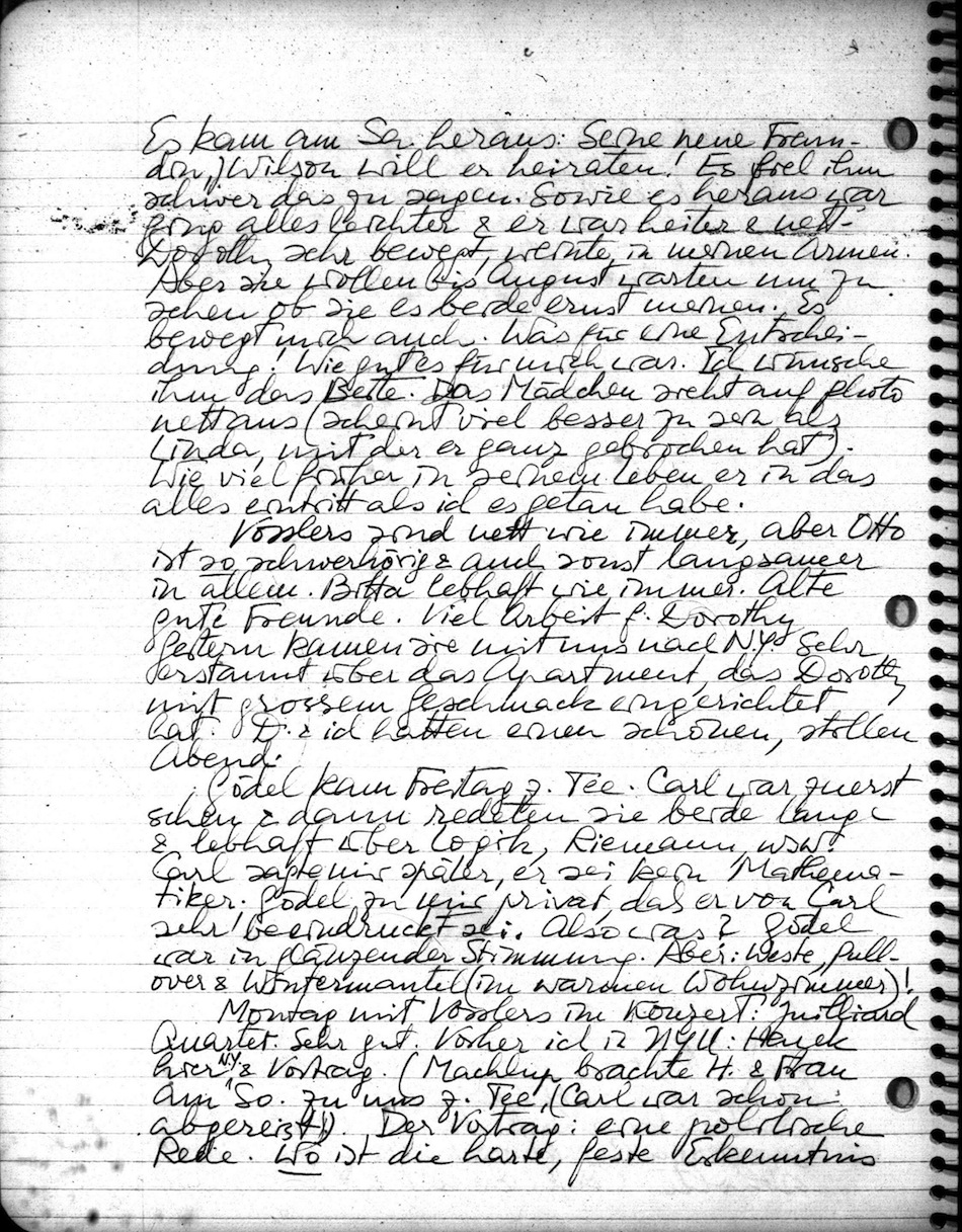 Montag mit Vosslers im Konzert: Juilliard Quartet. Sehr gut. Vorher ich in NYU: Hayek hier N.Y. & Vortrag. (Machlup brachte H. & Frau am So. zu uns z. Tee, (Carl war schon abgereist). Der Vortrag: eine politische Rede. Wo ist die harte, feste Erkenntnis und wieso er als Nobelpreisträger?