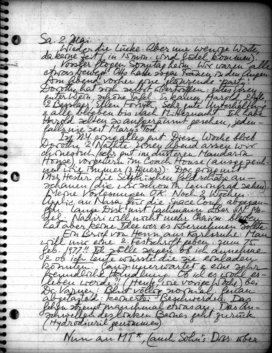 In N.Y. ging alles gut. Diese Woche bliebe Dorothy 2 Nächte. Einen Abend assen wir chinesisch (sehr gut im düsteren Mandarin House), vorgestern im Coach House (ausgezeichnet wie immer (& teuer). Dor. ging mit Mrs. Hester die Seythischen Goldschätze anschauen (die wir schon in Leningrad sahen). Meine Vorlesungen OK. Noch 2 Wochen. Applic. an Nasa für die Space Conf. abgegangen. Lange Disk. mit Lachmann über v.N. Model. Nadiri will nicht mehr Chairm. bleiben, hat aber keine Idee wer es übernehmen sollte.