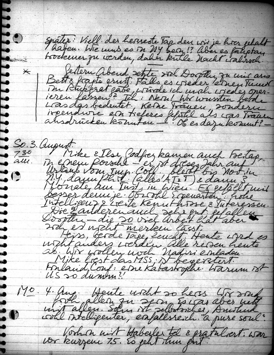 Es gab keine, aber es ist nicht immer leicht wieder in Schwung zu kommen. Dazu die Nachrichten über Helsinki Conf., das Amerik. Debacle (Ford & Kissinger) etc. Schwimmen; die ersten Photos die mit der Nikomat aufgenommen waren (werden sie am Abend projezieren). Karin beginnt heute ihren Photo Kurs im Art Center, was mich freut. Sie sage heute, daß sie bemerkt wie viel mehr sie wüsste als Altersgenossen hier. Warum?: "Die Familie & die Reisen". Gut.