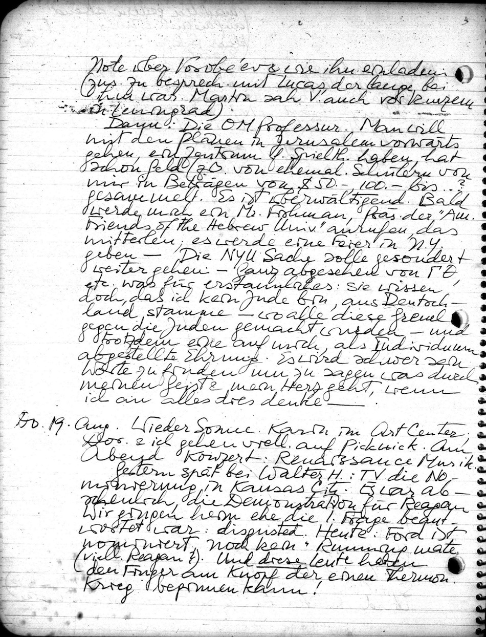 Gestern spät bei Walter H.: TV die Nominierung in Kansas City. Es war abscheulich, die Demonstration für Reagan. Wir gingen heim ehe die 1. Frage beantwortet war: disgusted. Heute: Ford ist nominiert, noch kein Running mate (viell. Reagan?). Und diese Leute haben den Finger am Knopf der einen Thermon. Krieg beginnen kann!