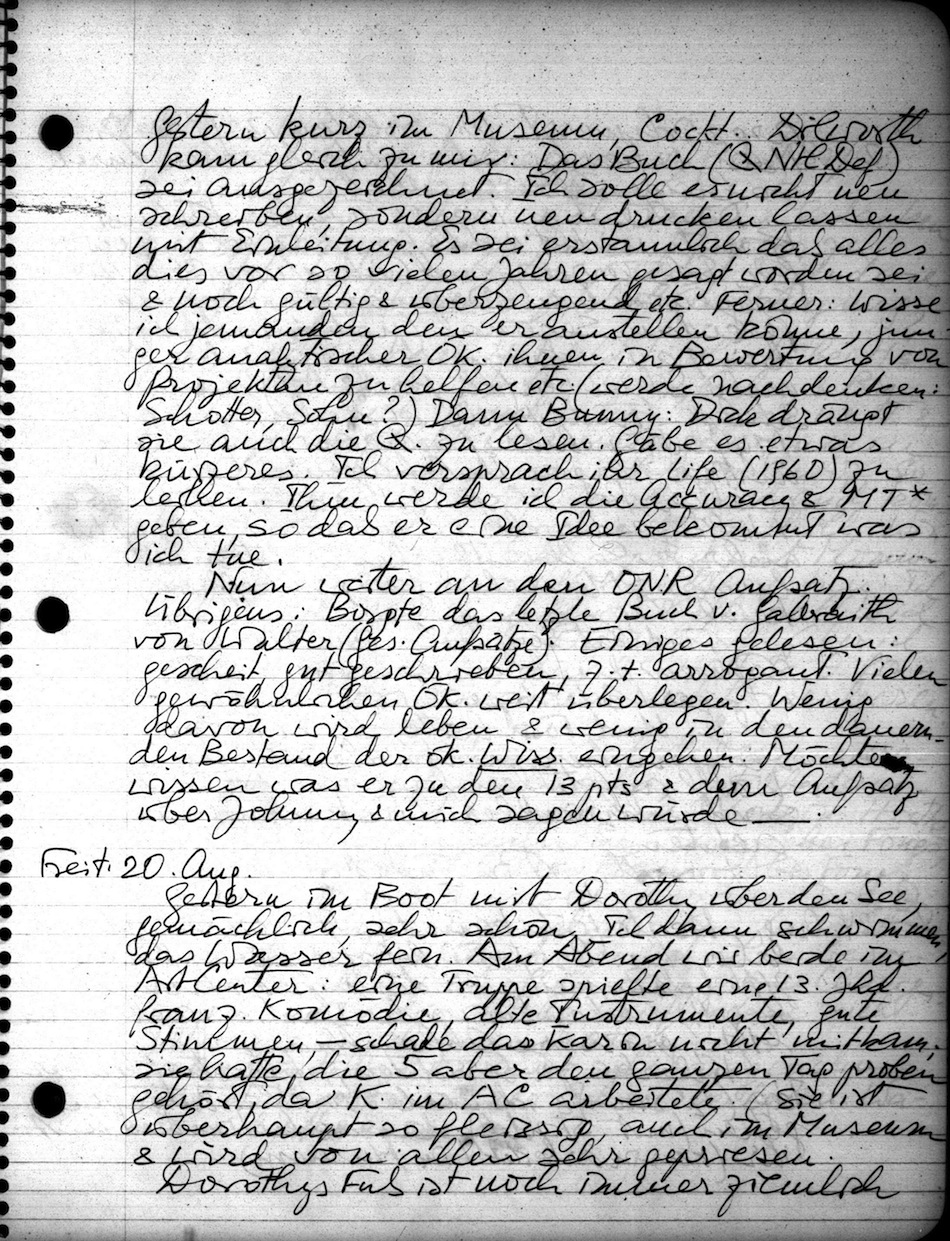Gestern kurz im Museum, Cockt. Dilworth kam gleich zu mir: Das Buch (Q Ntl. Def.) sei ausgezeichnet. Ich solle es nicht neu schreiben, sondern neu drucken lassen mit Einleitung. Es sei erstaunlich daß alles dies vor so vielen Jahren gesagt worden sei & noch gültig & überzeugend etc. Ferner: wisse ich jemanden den er anstellen könne, junger analytischer Ök. ihnen in Bewertung von Projekten zu helfen etc. (werde nachdenken: Schotter, Sohn?) Dann Bunny: Dick drängt sie auch die Q zu lesen. Gäbe es etwas kürzeres. Ich versprach ihr Life (1960) zu leihen. Ihm würde ich die Accuracy & MT* geben, so daß er eine Idee bekommt was ich tue.