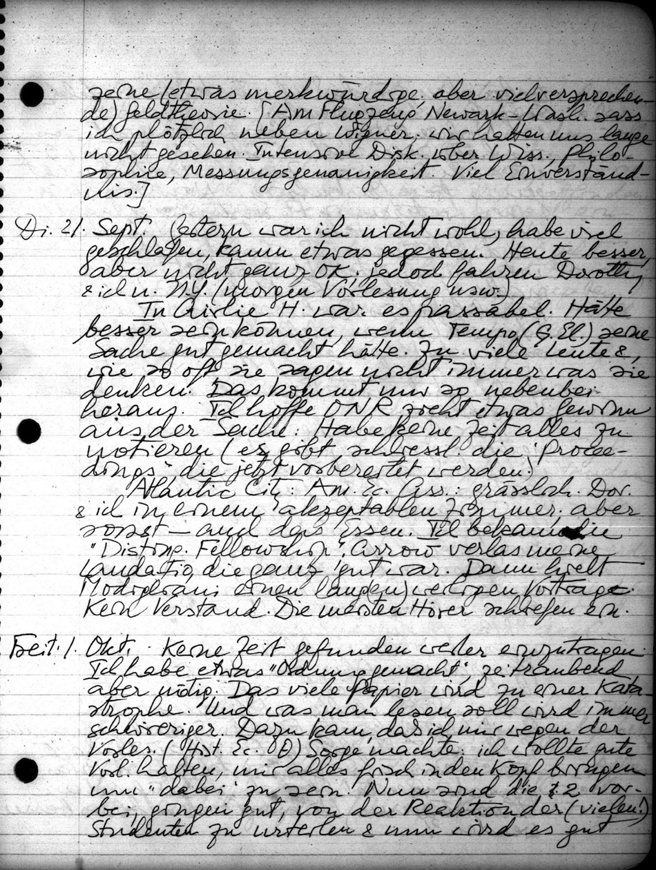 Ferner: 3 Tage at Airlie House in Virginia, die ONR Conf. Am Wash. Ntl. Airport erwartete mich Shubik & wir wurden zum A.H. gefahren (~ 1h). Sehr gute Unterhaltung; er wieder in detail über seine (etwas merkwürdige, aber vielversprechende) Geldtheorie. [Am Flugzeug Newark-Wash. sass ich plötzlich neben Wigner; wir hatten uns lange nicht gesehen. Intensive Disk. über Wiss., Philosophie, Messungsgenauigkeit. Viel Einverständis.]