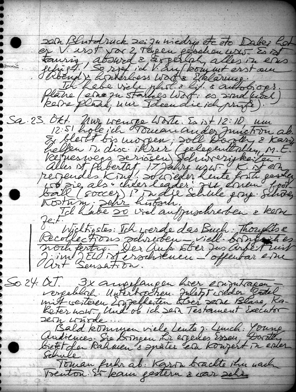 Toman fuhr ab. Karin brachte ihn nach Trenton. Er kam gestern & war sehr gut. Resultat: unsere4 Kinder völlig normal in ihrem Verhalten; was es an gelegentlichen Komplikationen gibt: kommt in allen Familien vor, geht vorbei. Man soll sie mehr allein lassen, nur klar machen, wie sehr man sie liebt, daß sie mit allen (mögl.) Problemen kommen können, daß sie eben aufwachsen. Ich bin an manchem Schuld: meine Krankheit & die Zeichen meiner oft starken Schmerzen, sowie daß ich "berühmt" sei etc.