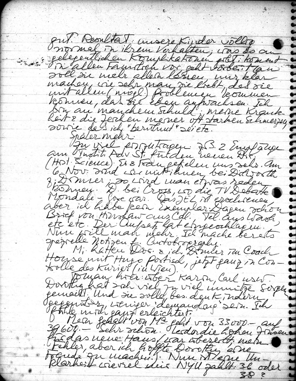 Mein Gehalt von Ma geht von 33 000,- auf 39 600,- Sehr schön. Leider die hohen Zinsen für das neue Haus (war übereilt; mein Fehler, aber ich hoffte Dorothy eine Freude zu machen). Nun ist eine Unklarheit wieviel mir NYU zahlt: 36 oder 38? Aber keine Tragödie. Das Devel. Off. sagt es ging mit der Prof. gut weiter. Winder wird sich dieser Tage mit Mommsen treffen. (Aber ich kann ihm keine individ. reichen Deutschen nennen).