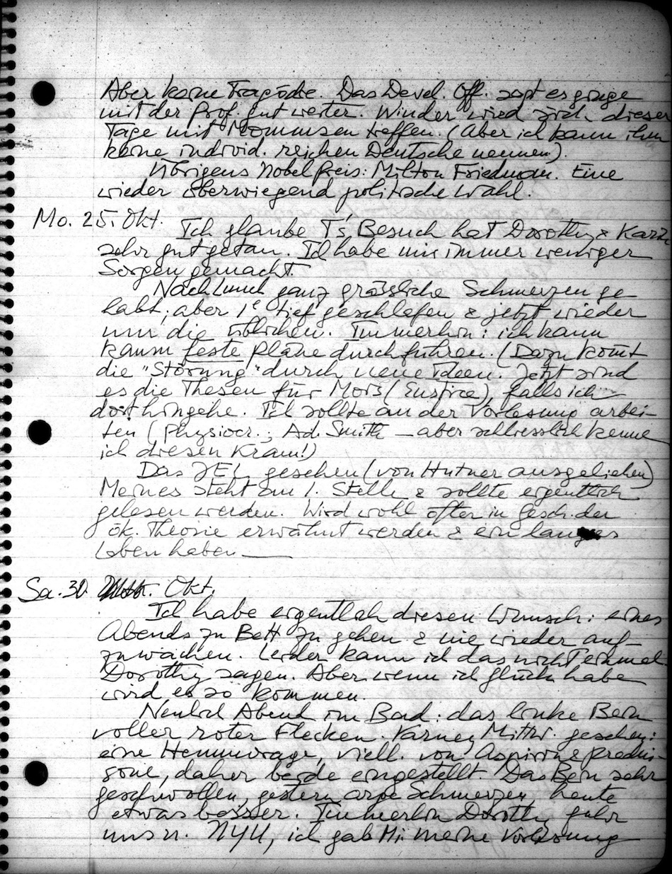 Zu viel einzutragen. Z.B. 2 Empfänge am Inst. Adv St. für den neuen Dir. (Hist. Science). Er & Frau gefielen uns sehr. Am 6. Nov. sind wir mit ihnen bei Dilworth z. Dinner; so wird man etwas reden können. D. bei Cross, wo die TV Debatte Mondale-Gore war. Das JEL ist erschienen, aber ich habe kein Exemplar. Dagen schon Brief von Hinshaw aus Cal. Tel. aus Wash, etc etc. Der Aufsatz hat eingeschlagen. Nun will man mehr. Ich mache bereits spezielle Notizen f. Autobiographe.