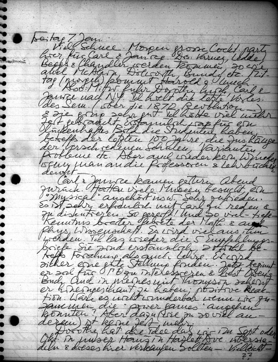 Carl & Janice kamen gestern Abend zurück. Hatten viele Museen besucht, ein "Musical" angehört usw. Sehr zufrieden. Es ist sehr erfreulich mit Carl zu reden & zu diskutieren. So gereift! Und so viel tiefe Kenntnis breiter Gebiete der Math. & auch Phys. Wissenschaft. Es wird viel aus ihm werden. Ich las wieder die 5 Empfehlungsbriefe. Sie sind erstaunlich, sowohl betreffs Forschung als auch Lehre. Er wird sicher eine gute Stellung finden. Jetzt beginnt er sich für G ? zu interessieren & liest Owen's Buch. Auch in meines mit Thompson scheint er hineingeschaut zu haben; positive Reaktion. Wäre es nicht wunderbar wenn wir zusammen die "power games" angehen könnten? Aber dazu (wie zu so viel anderem) ist keine Zeit mehr.