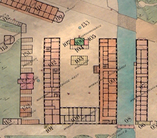 Umbaus zum Wohnhaus 1845 (rosa Teile). Der 1864 errichtete