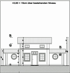 Mitteltrakt (grün) ebenerdig das Verkaufslokal und im Halbstock