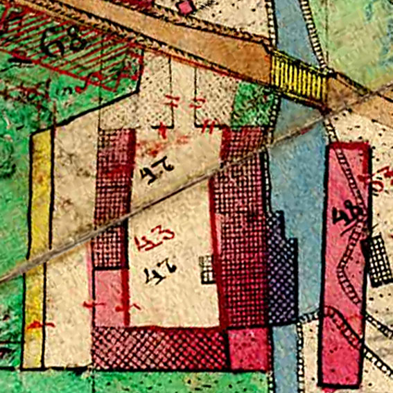 Der Komplex Arbeiterwohnhaus Altgebäude, erbaut 1833 als zweite Textilfabrik Marienthal (dunkel schraffierte Teile des hufeisenförmigen Baus) mit den Erweiterungen anlässlich des Umbaus zum Wohnhaus 1845 (rosa Teile). Der 1864 errichtete Consum im Hof, straßenseitig gelegen, ist nur angedeutet. Ausschnitt aus Alfred Offner & Josef Nosek: Kataster Dorf Gramatneusiedl in N[ieder]-Österreich. V[iertel] u[nter dem] W[iener] W[ald]. Steueramt Ebreichsdorf. 1869 (mit Ergänzungen 1876), Blatt 14 und 18. Quelle: Quelle: Archiv für die Geschichte der Soziologie in Österreich, Nachlass Georg Grausam, Signatur 48/01.03. |